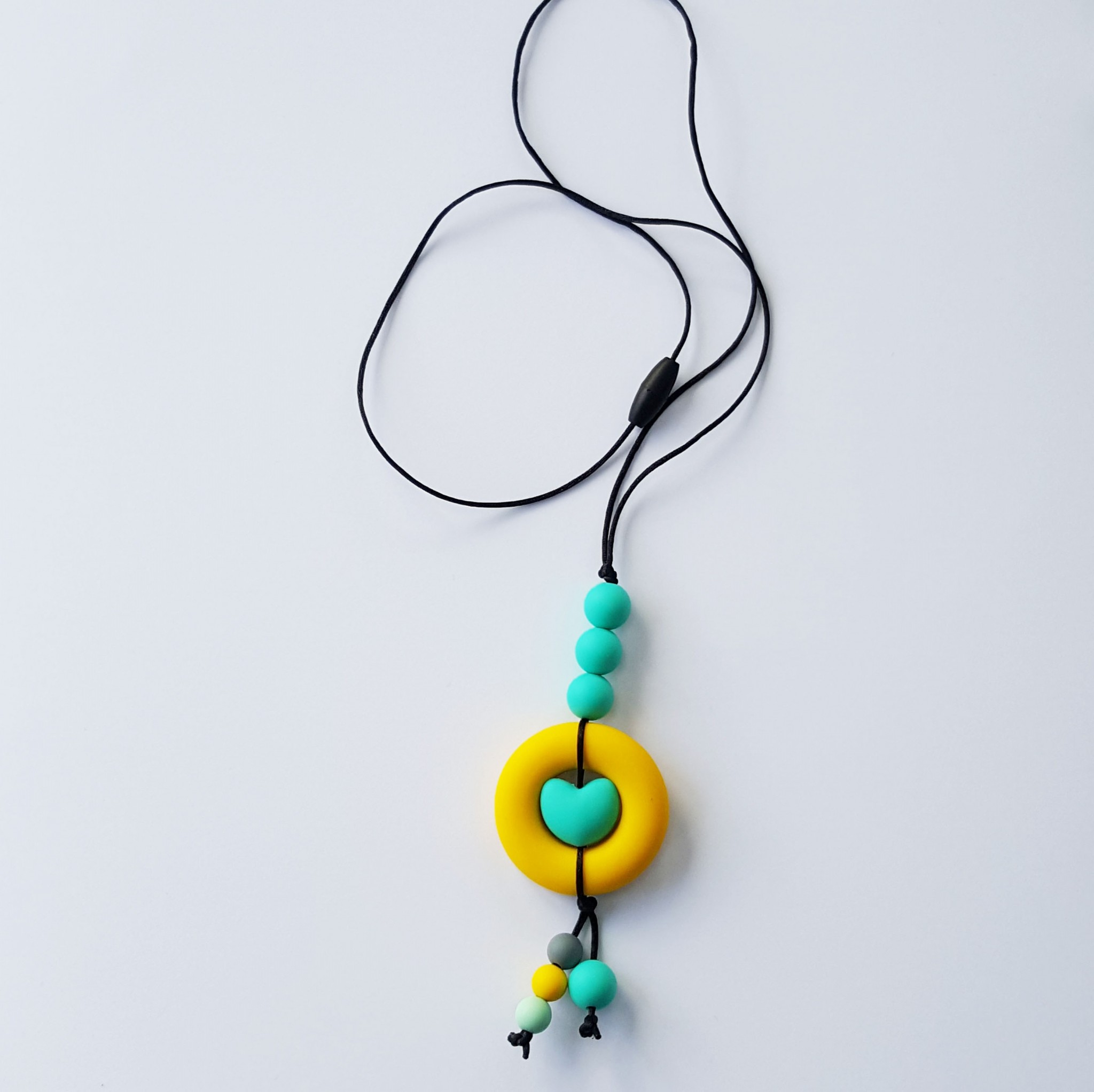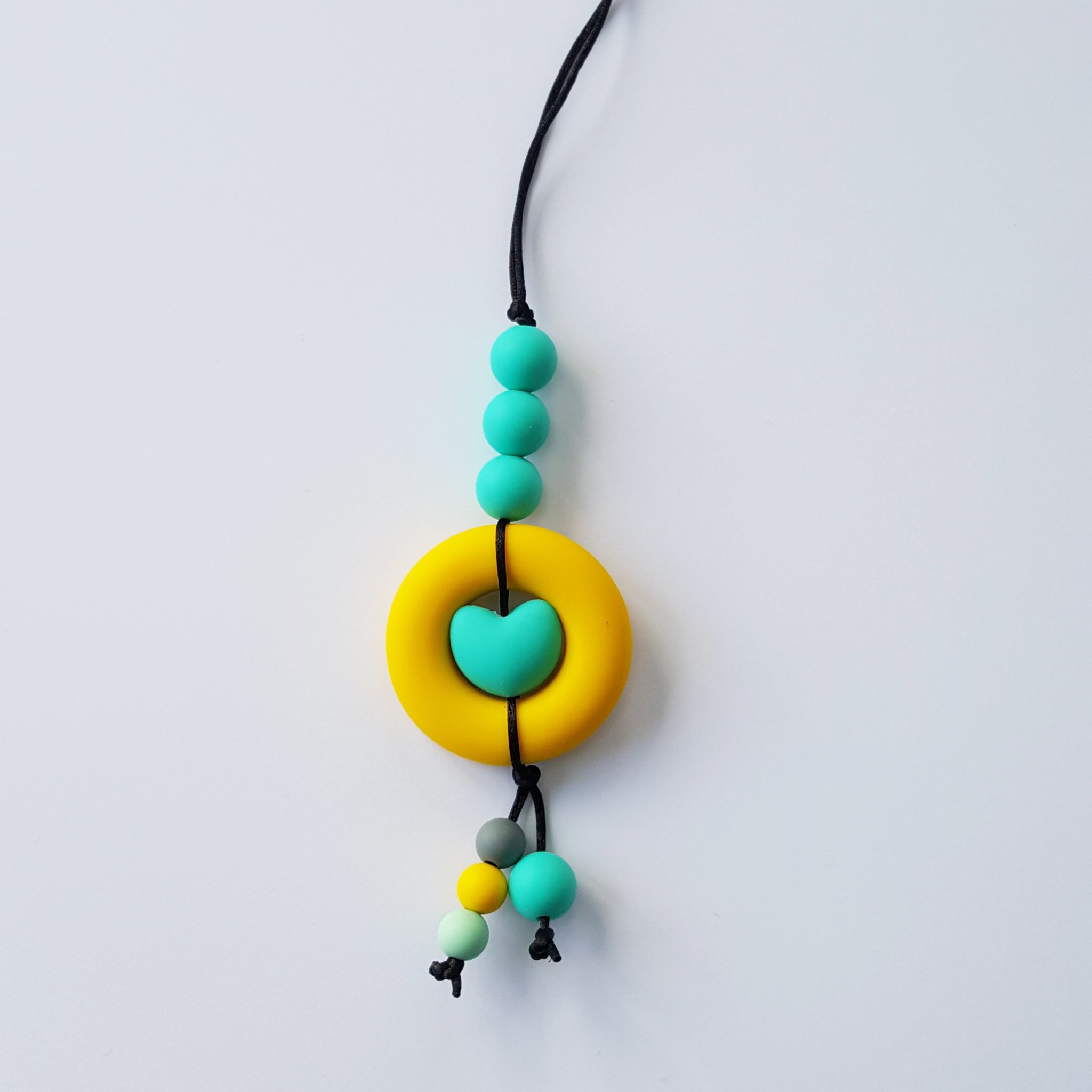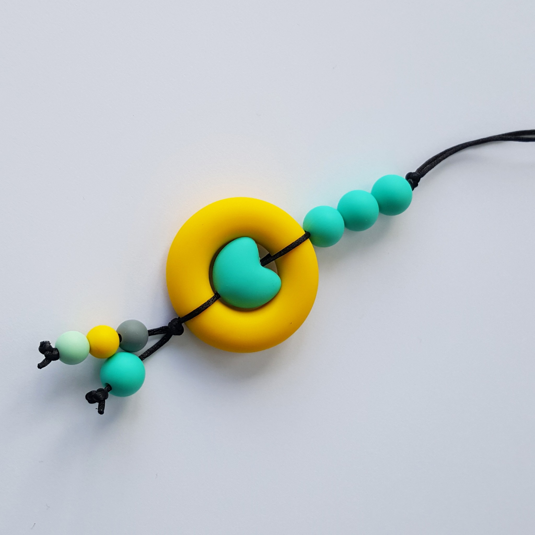 Ce collier permet des stimulations sensorielles orales, tactiles et visuelles de par ses textures, ses formes, ses couleurs.