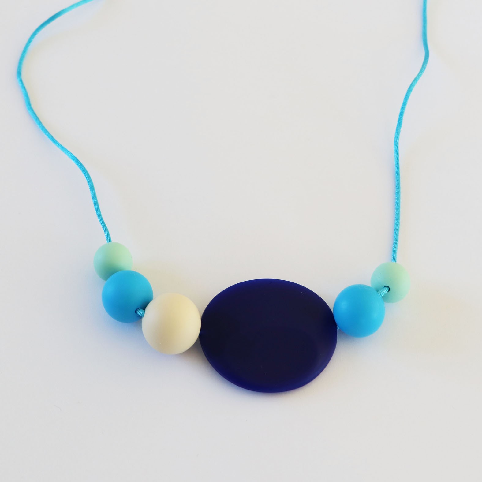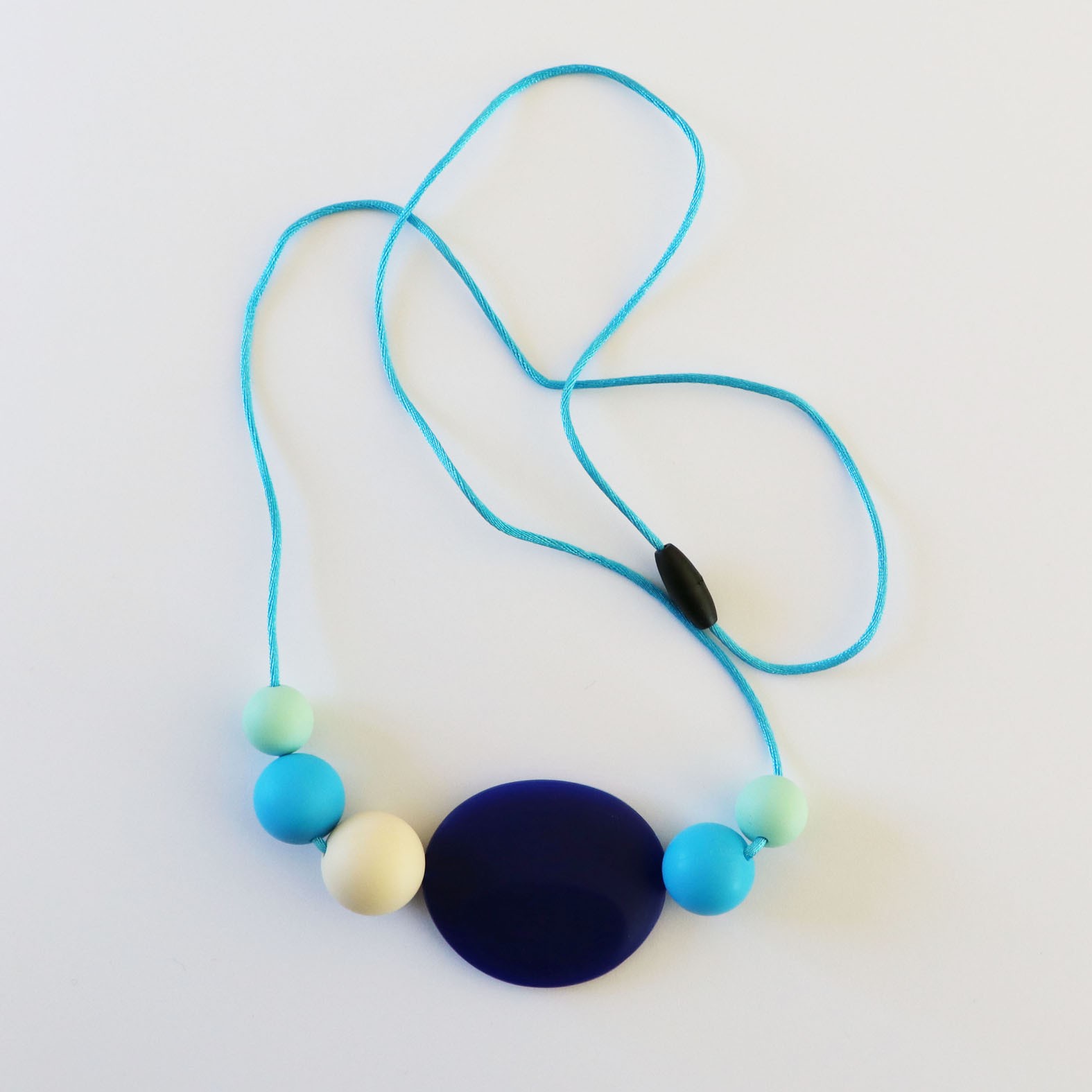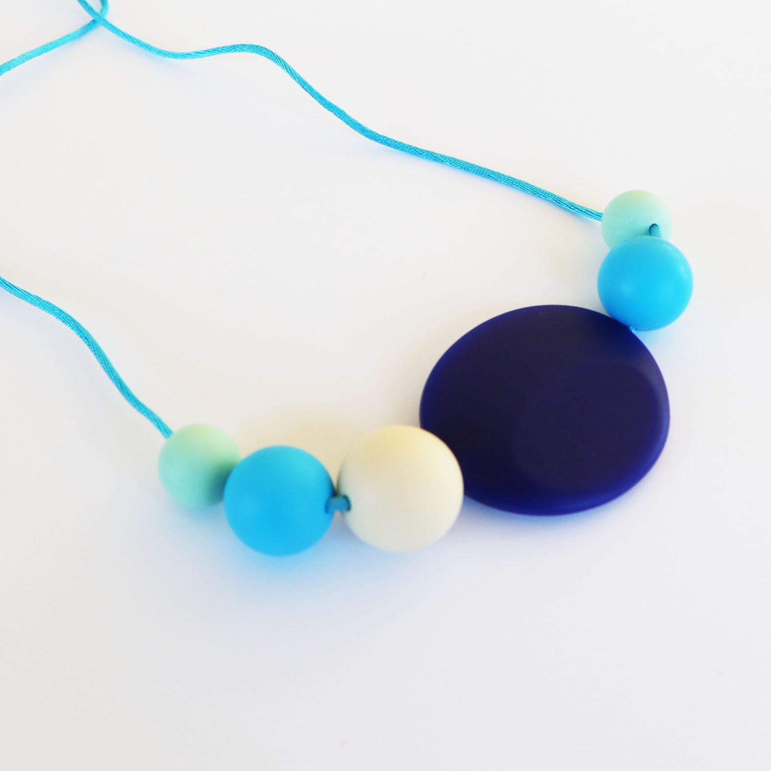 Ce collier permet des stimulations sensorielles orales, tactiles et visuelles de par ses textures, ses formes, ses couleurs.