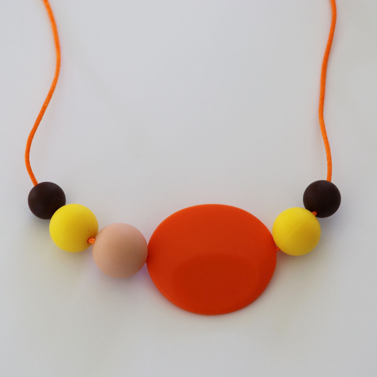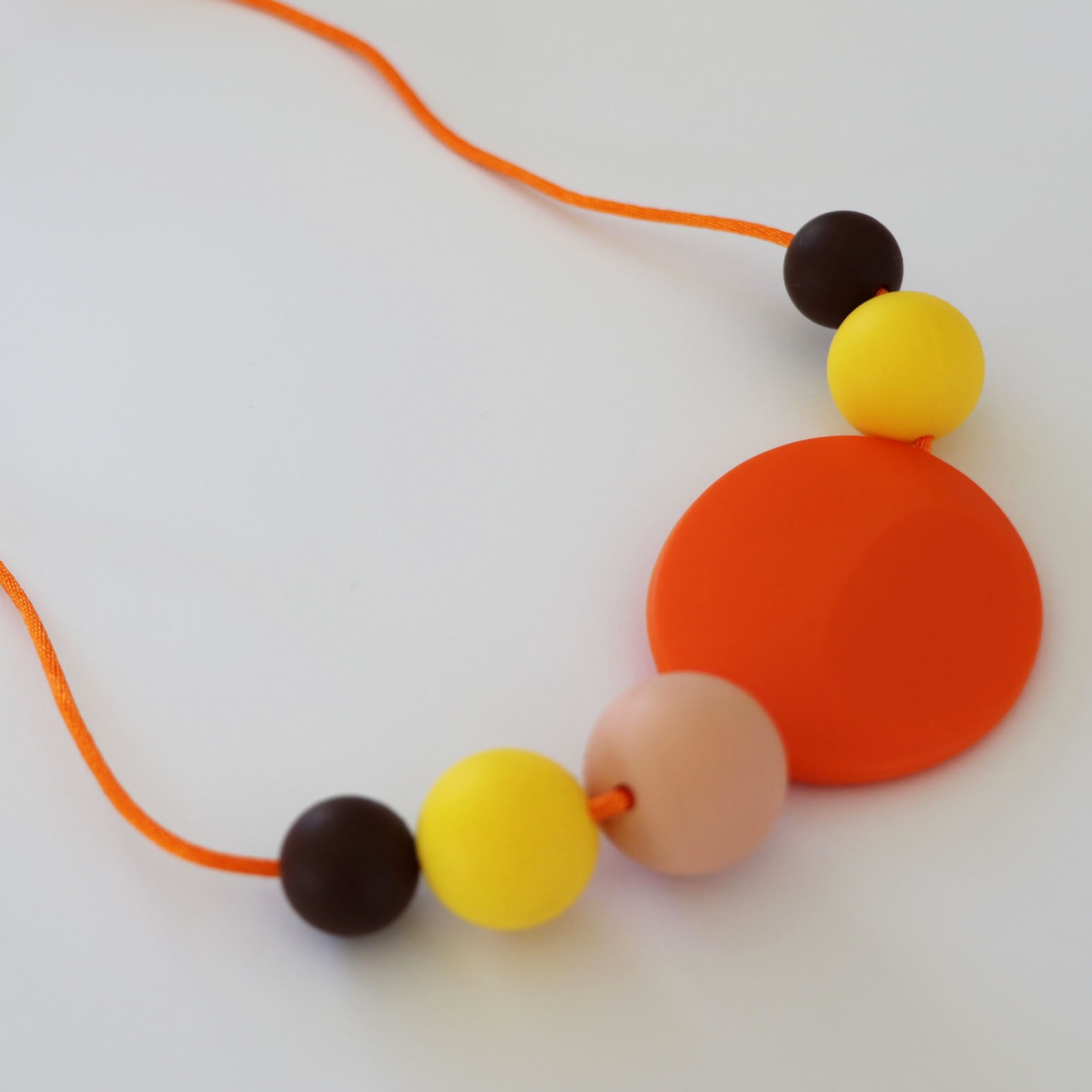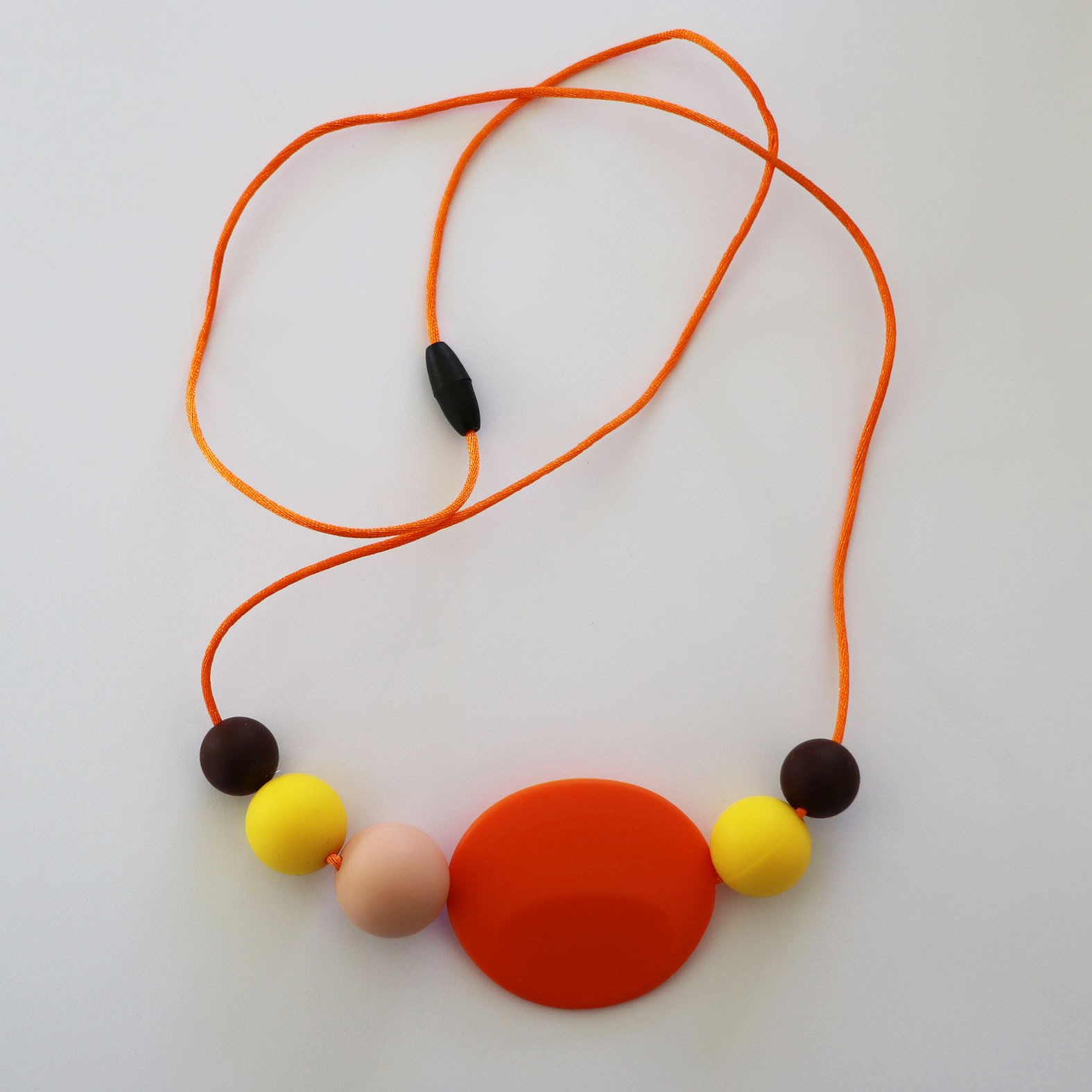 Ce collier permet des stimulations sensorielles orales, tactiles et visuelles de par ses textures, ses formes, ses couleurs.