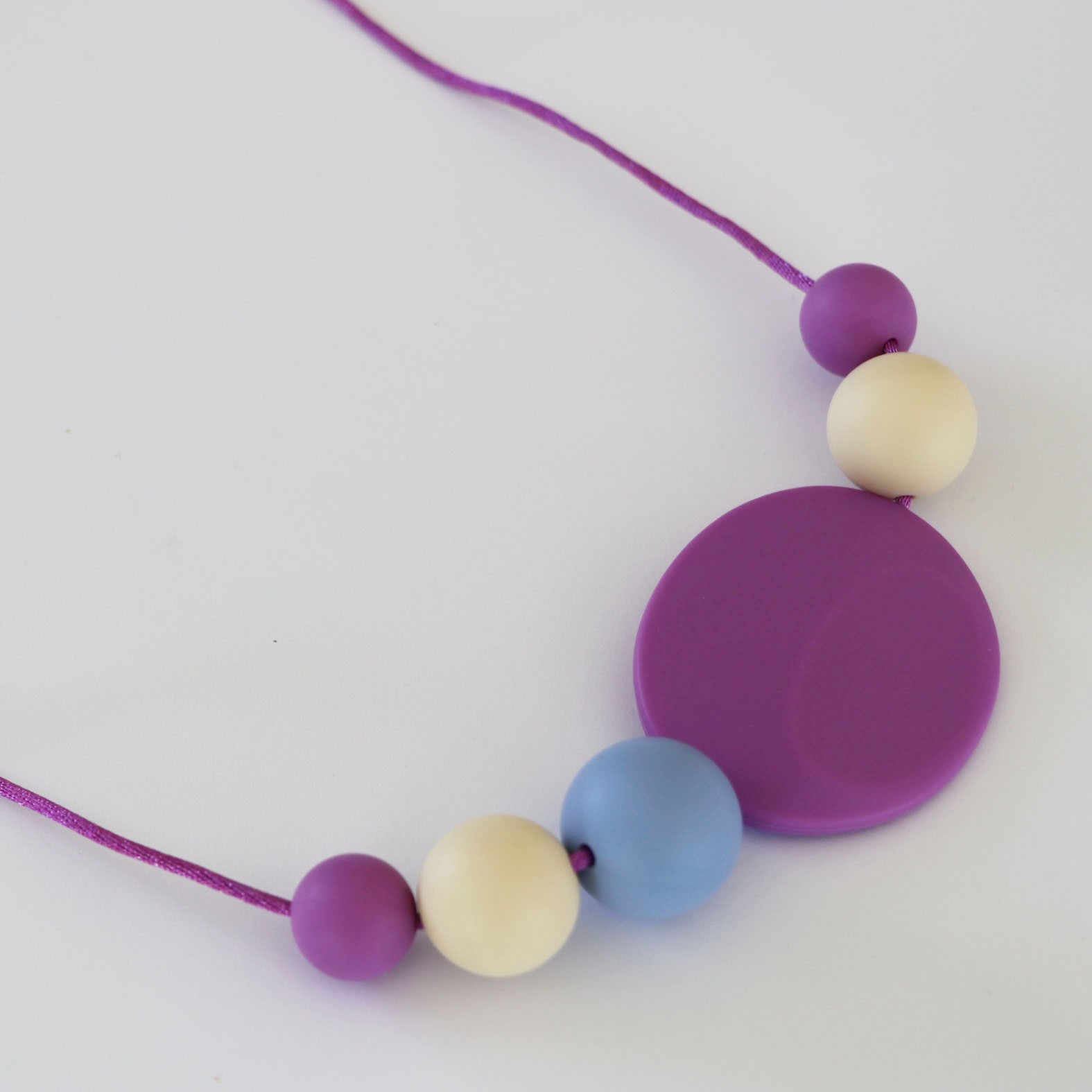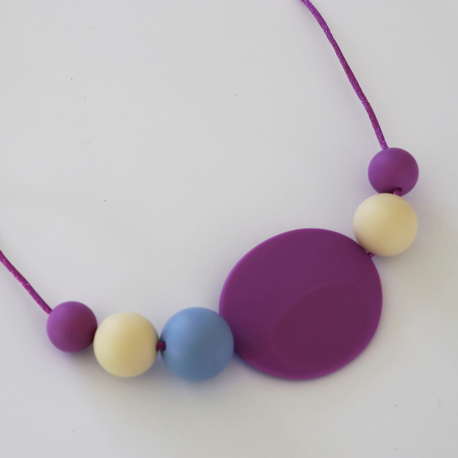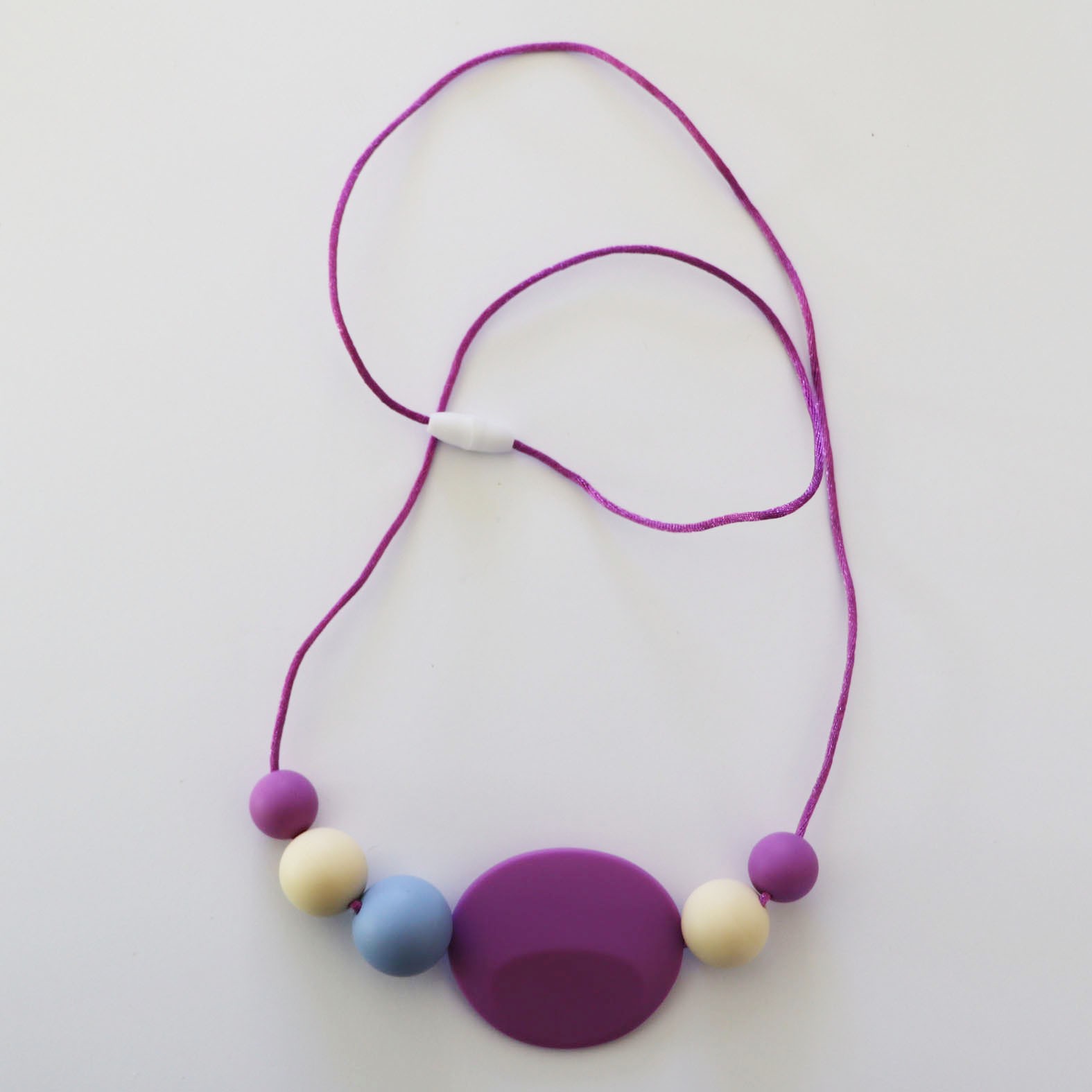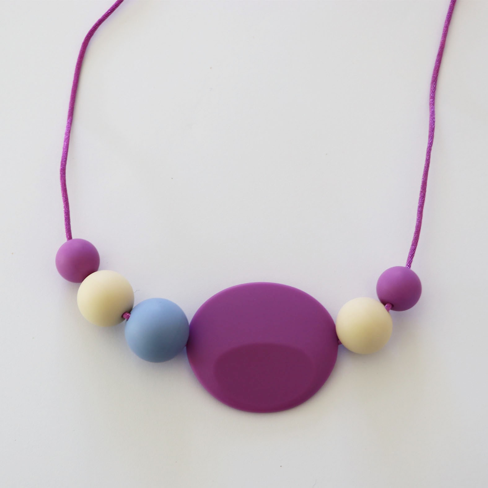 Ce collier permet des stimulations sensorielles orales, tactiles et visuelles de par ses textures, ses formes, ses couleurs.