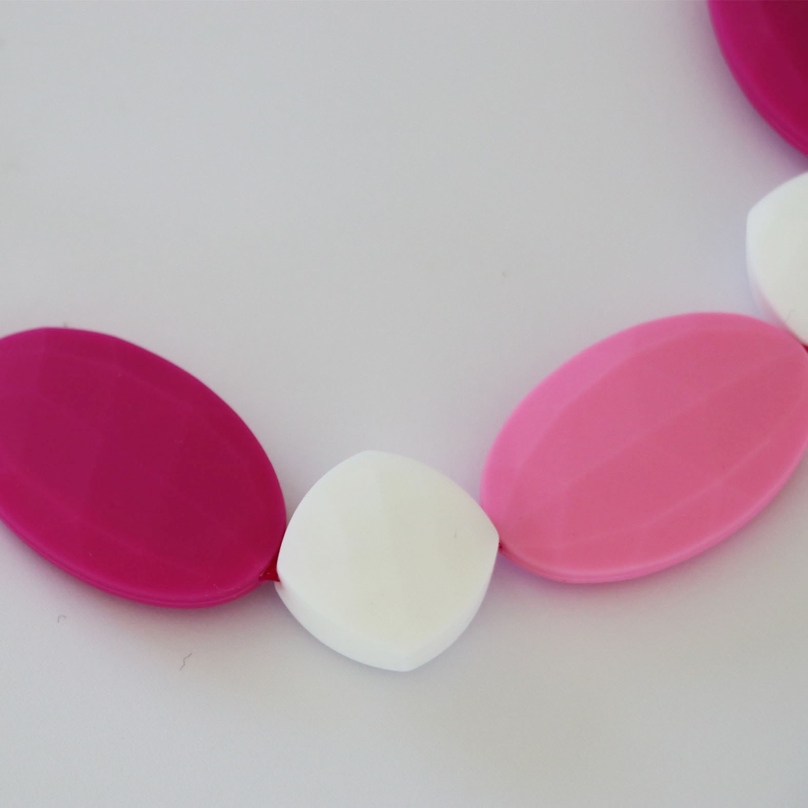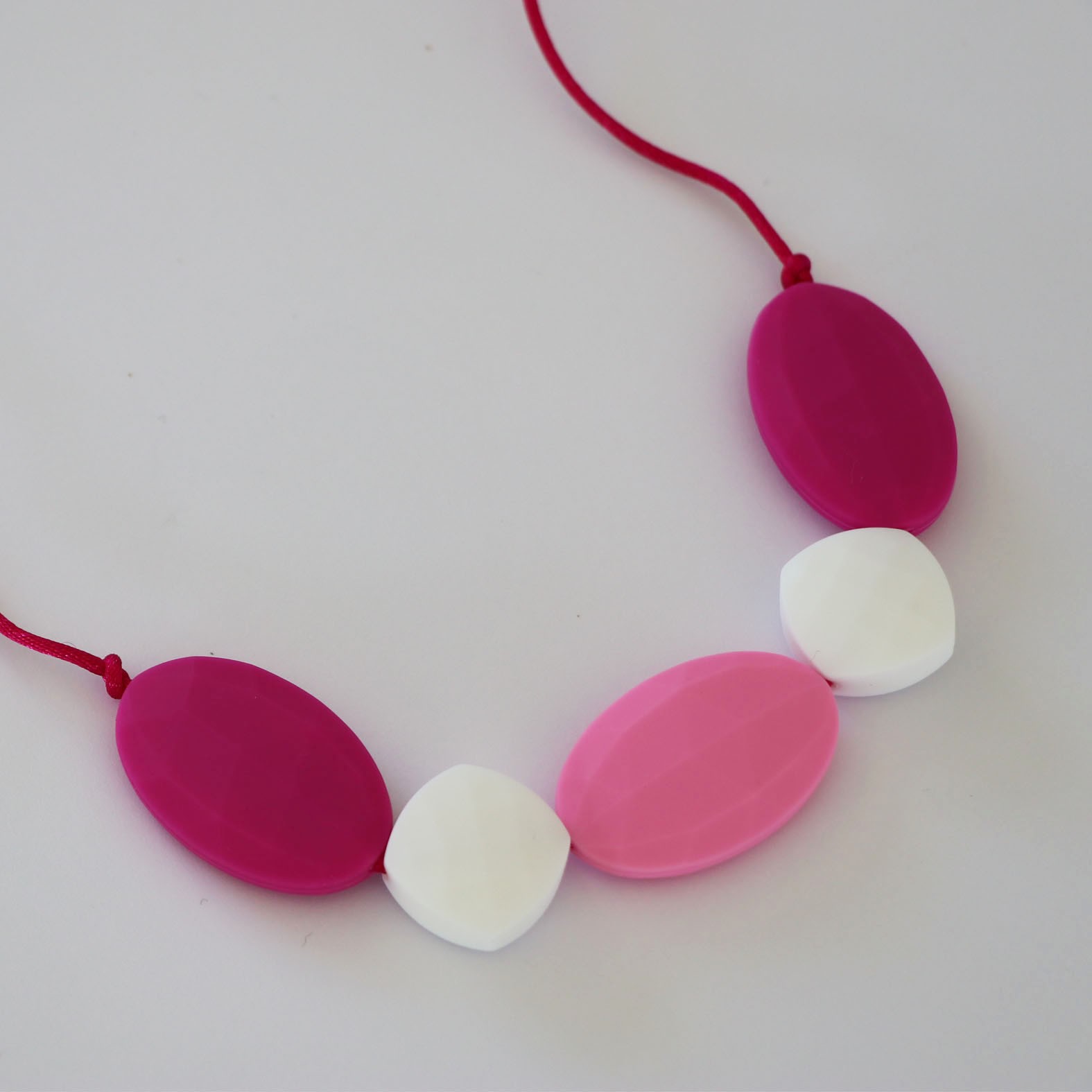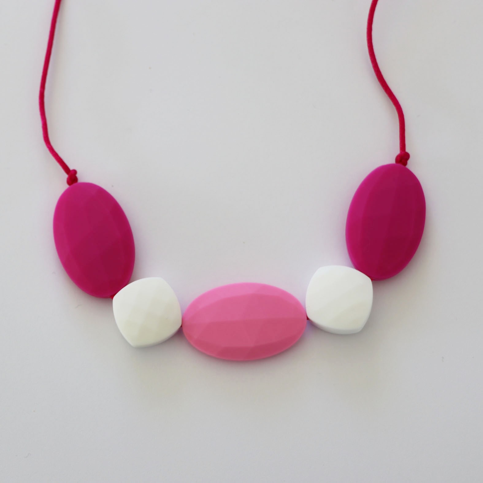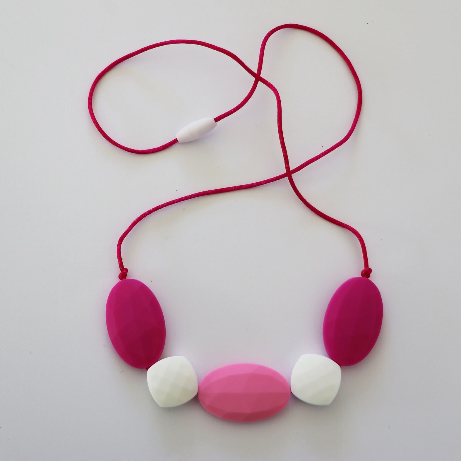 Ce collier permet des stimulations sensorielles orales, tactiles et visuelles de par ses textures, ses formes, ses couleurs.