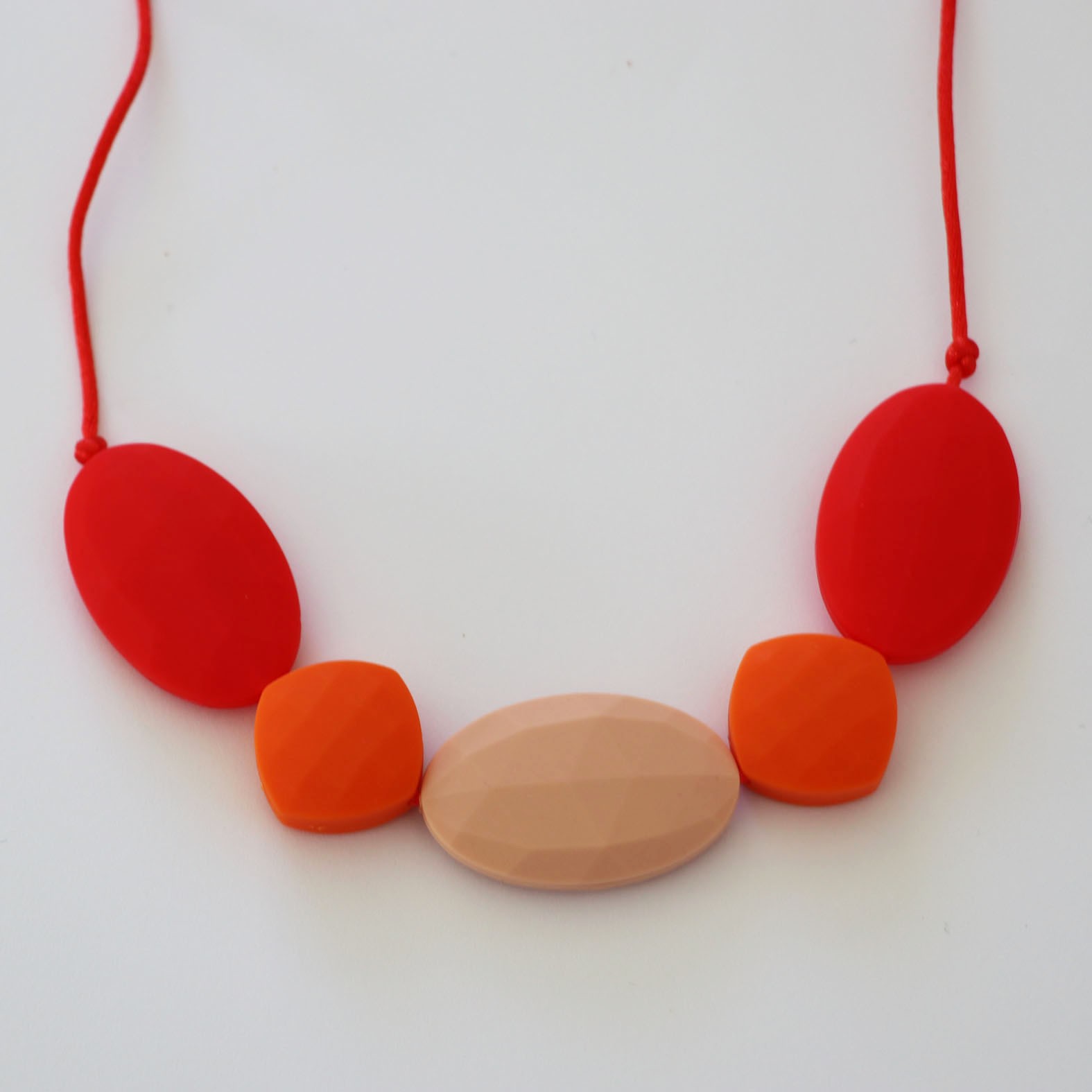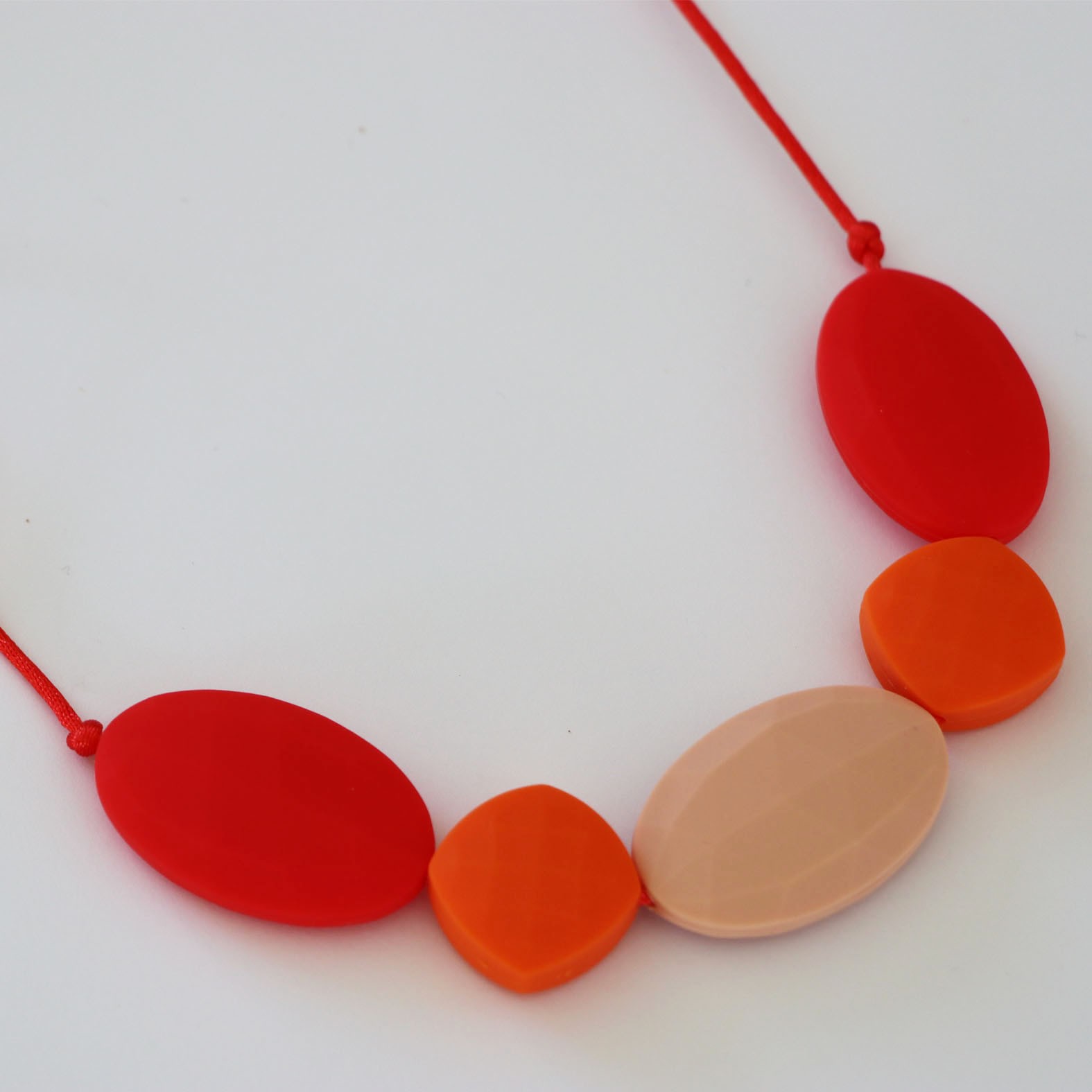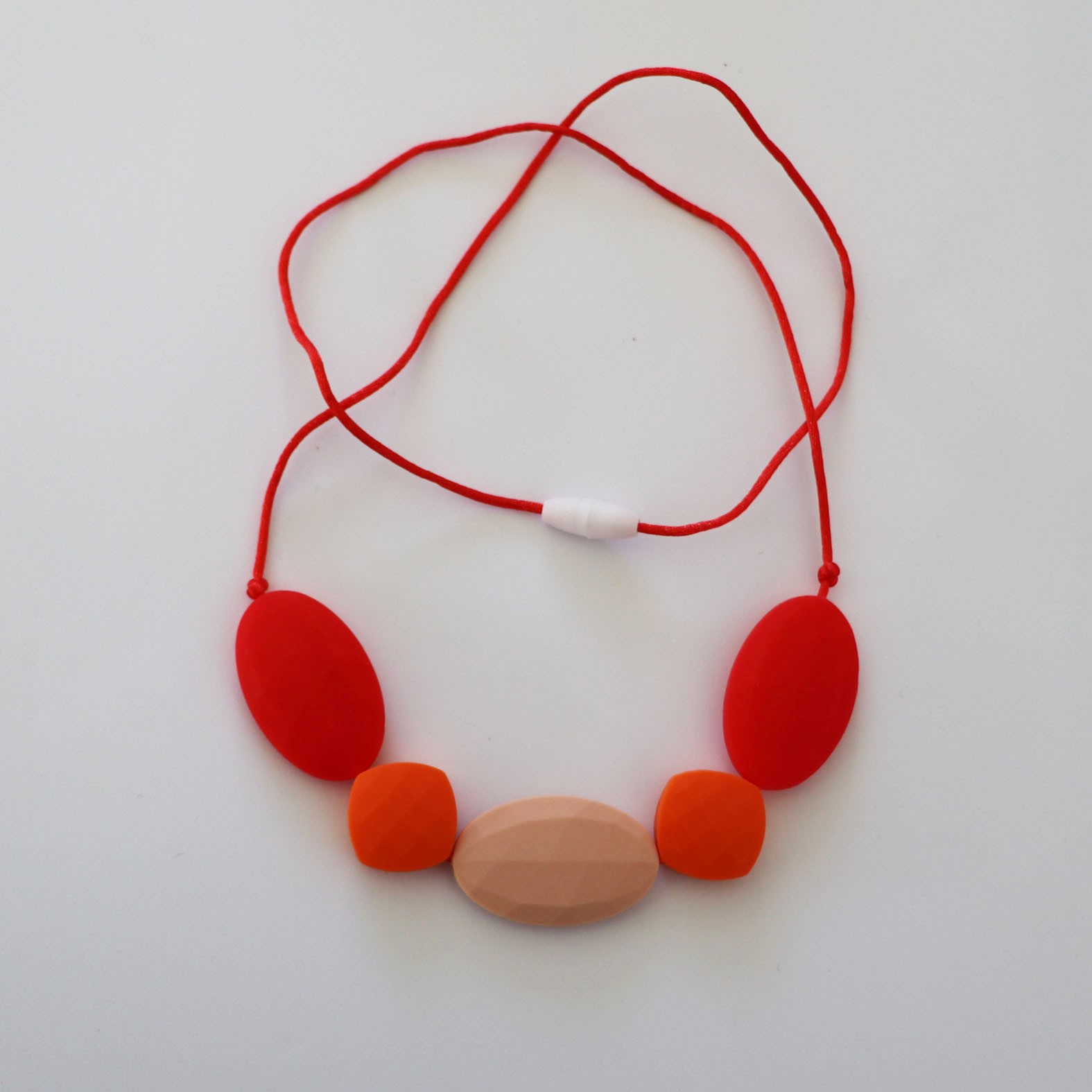 Ce collier permet des stimulations sensorielles orales, tactiles et visuelles de par ses textures, ses formes, ses couleurs.