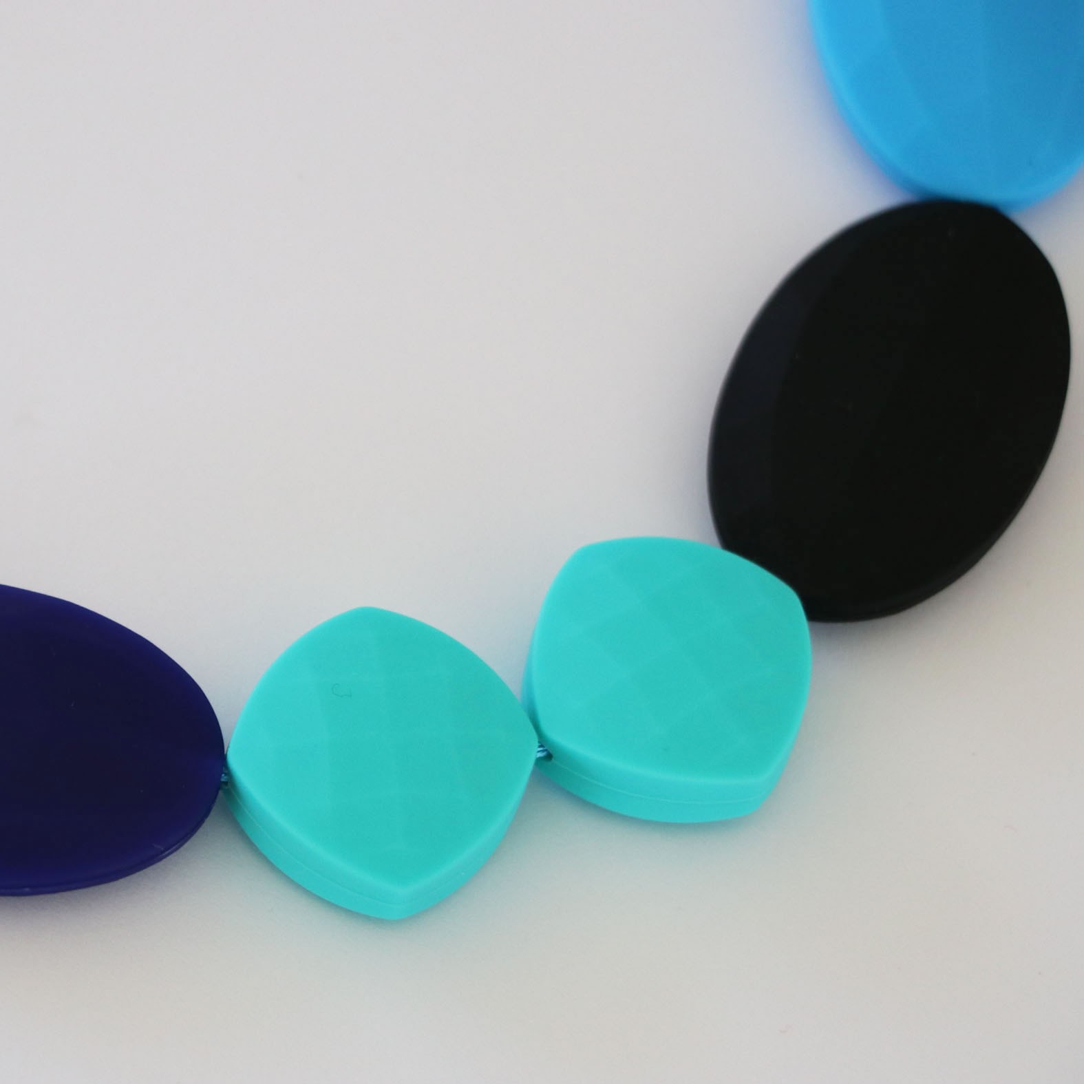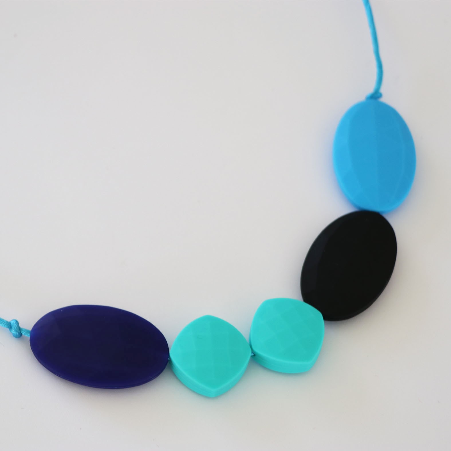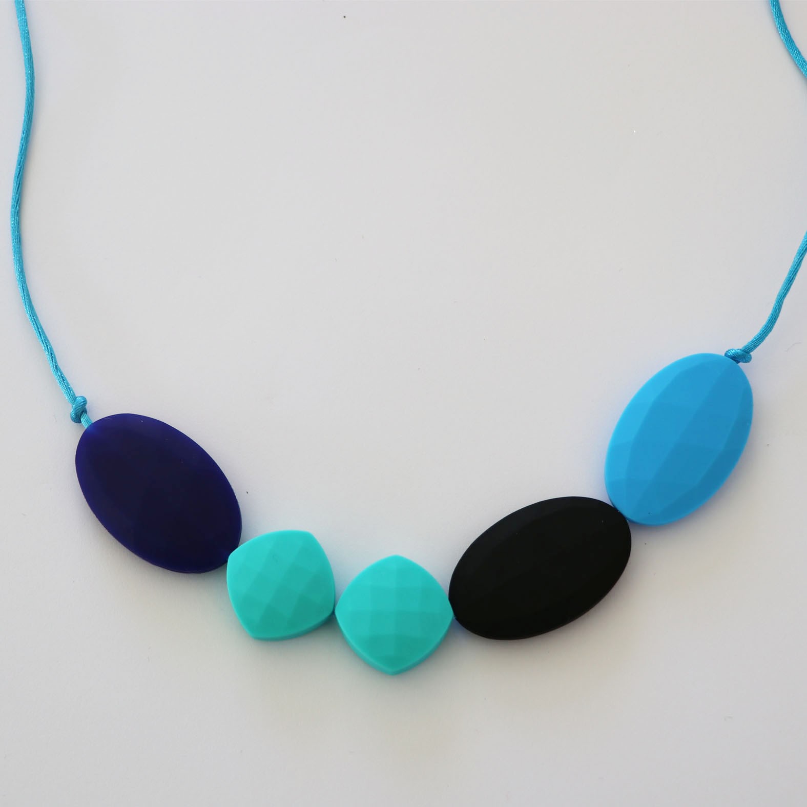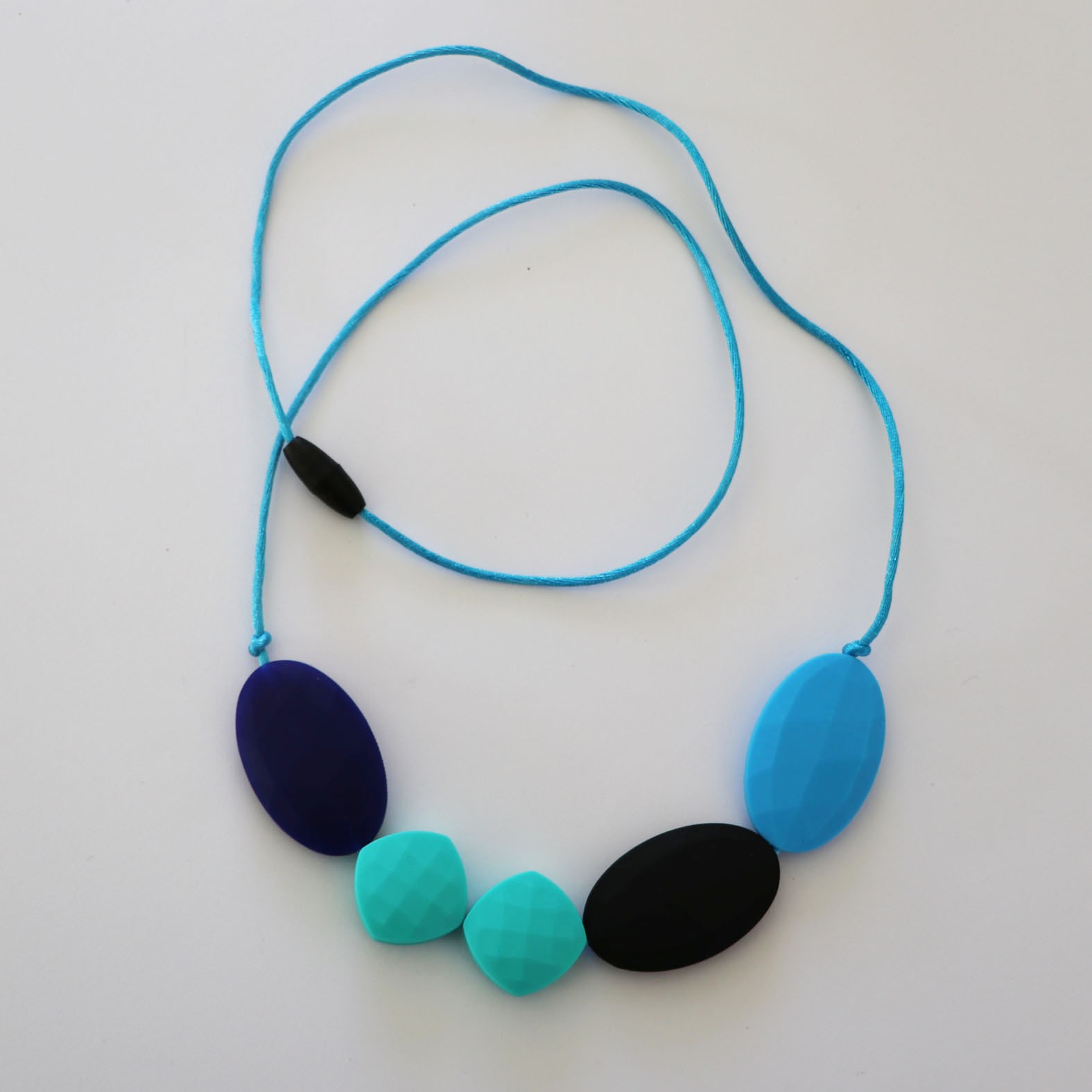Ce collier permet des stimulations sensorielles orales, tactiles et visuelles de par ses textures, ses formes, ses couleurs.