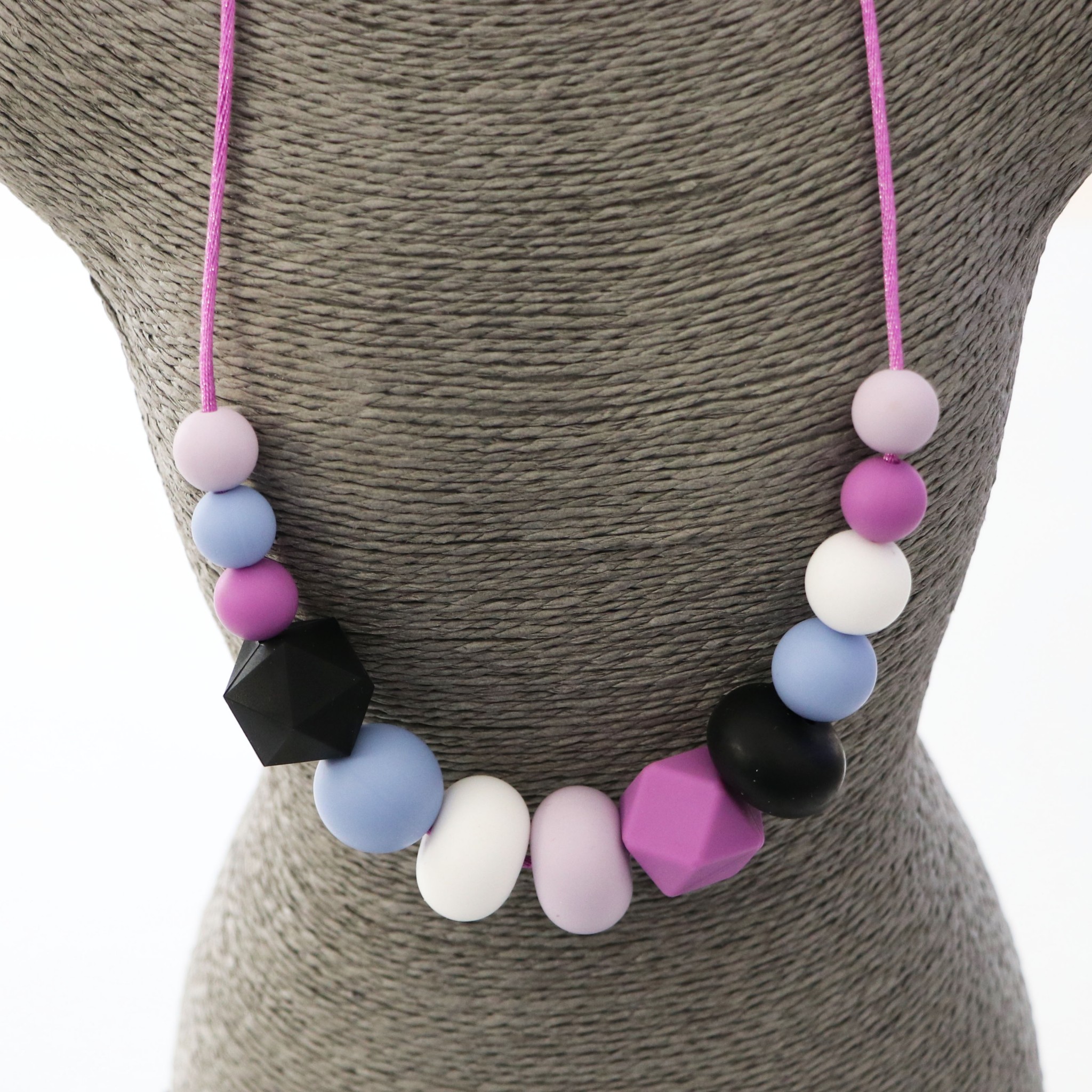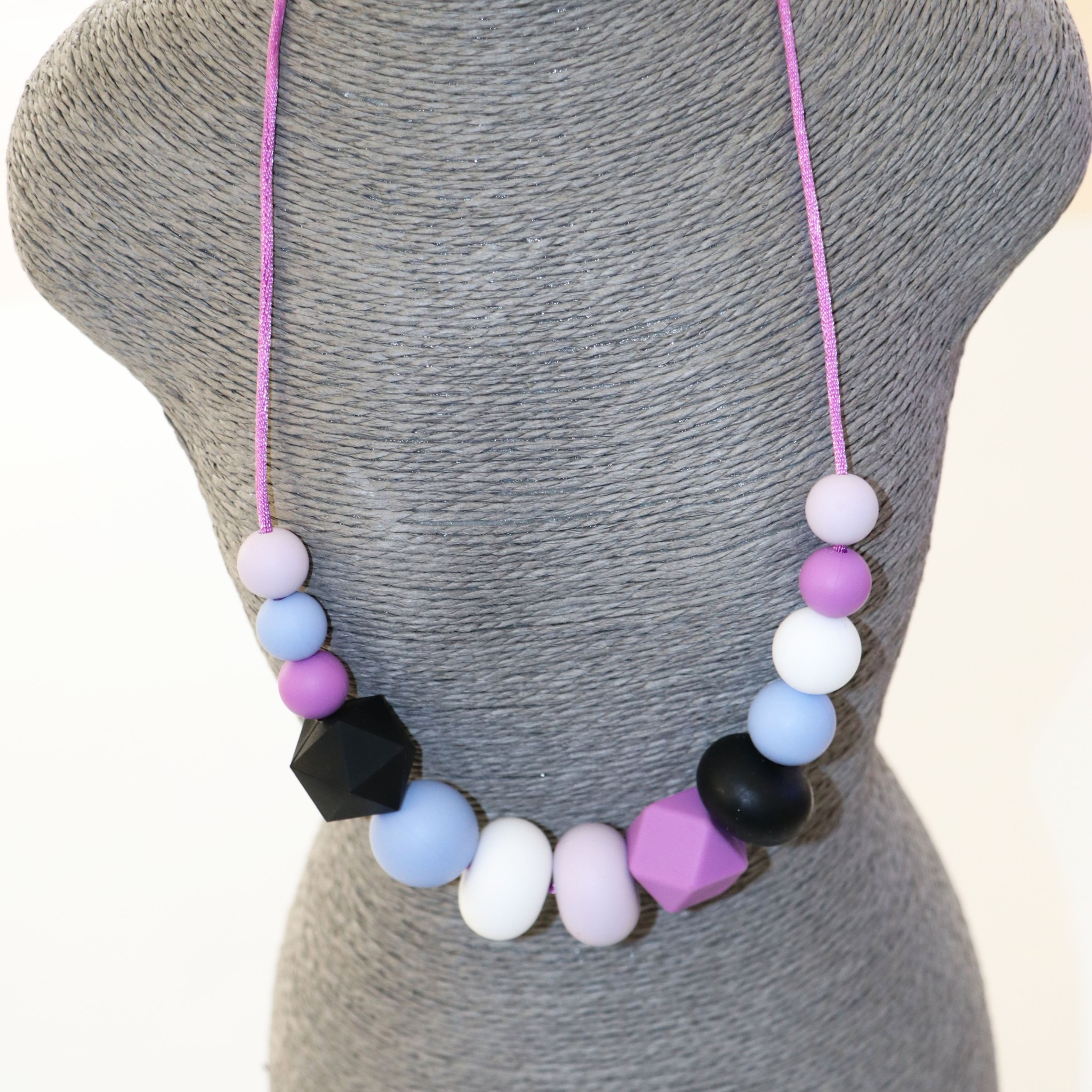 Ce collier permet des stimulations sensorielles orales, tactiles et visuelles de par ses textures, ses formes, ses couleurs.