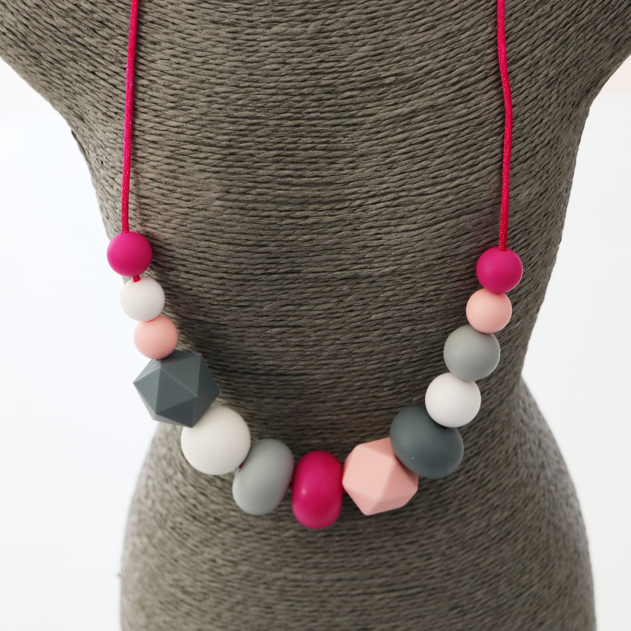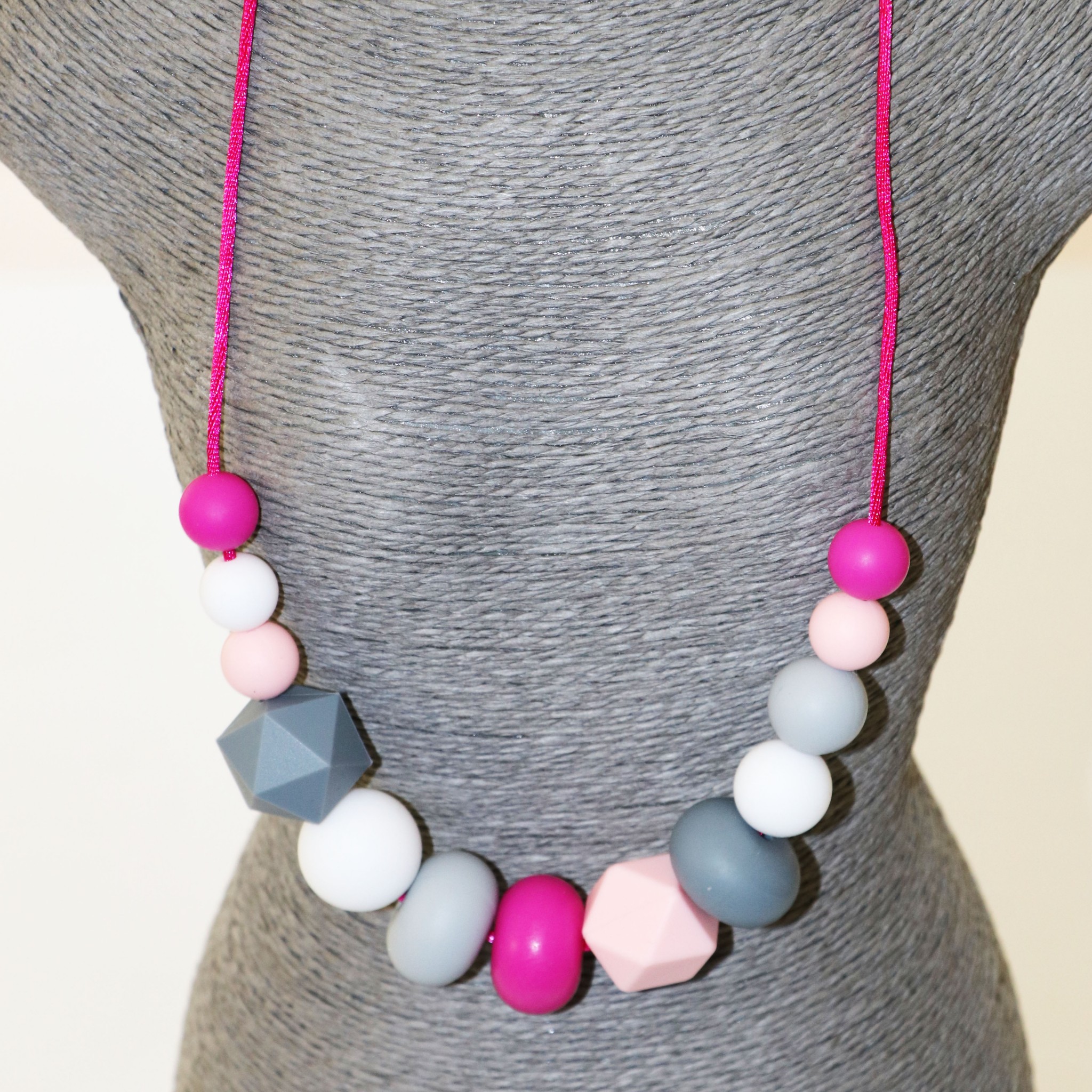 Ce collier permet des stimulations sensorielles orales, tactiles et visuelles de par ses textures, ses formes, ses couleurs.