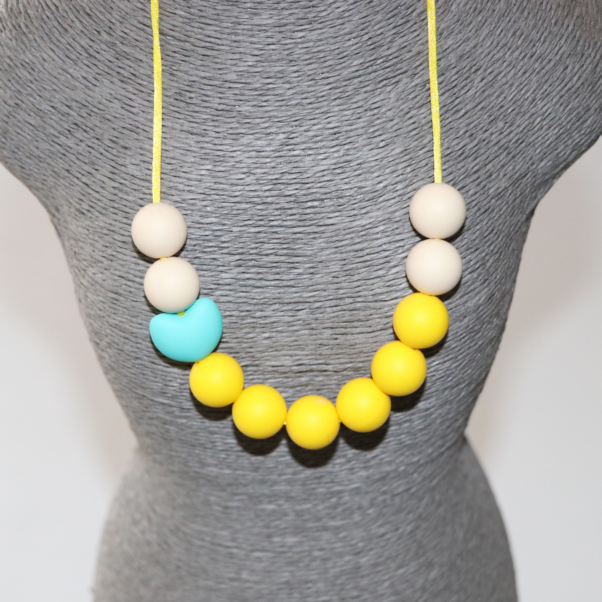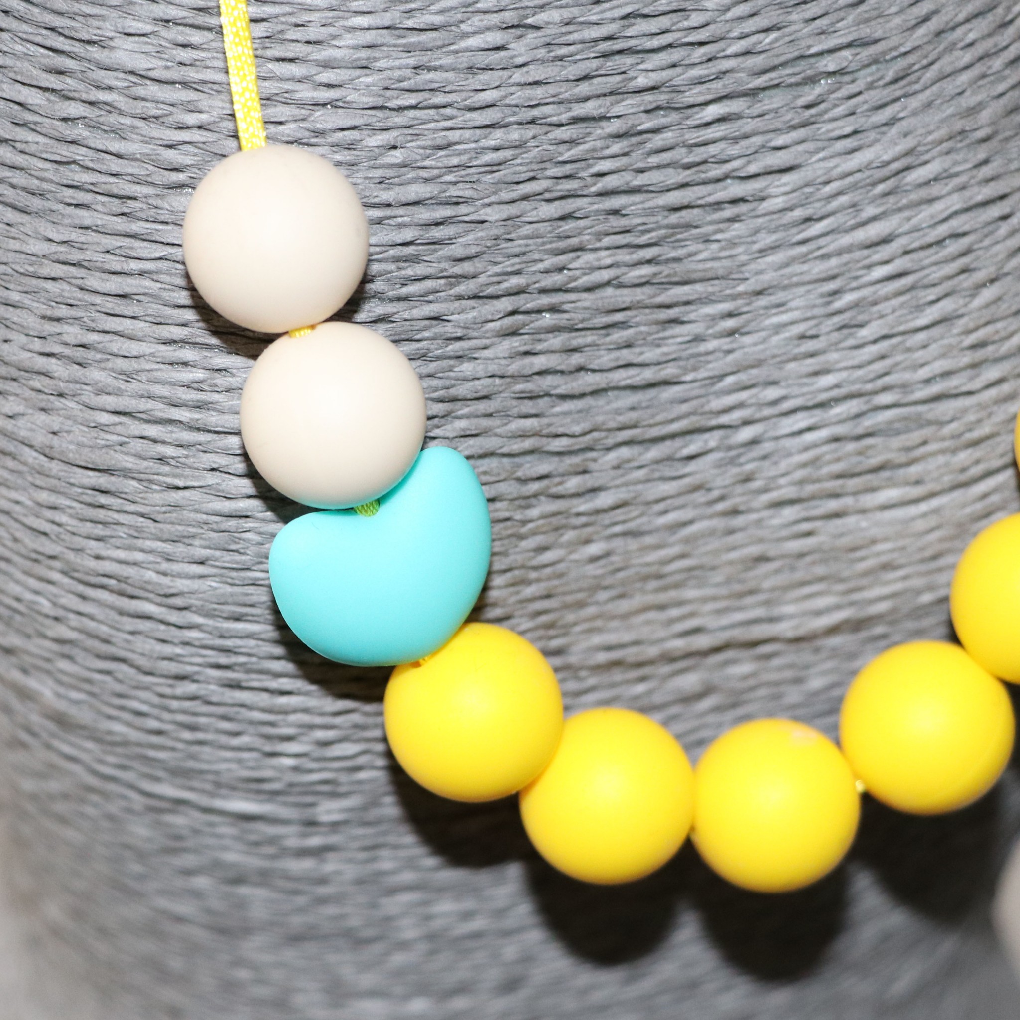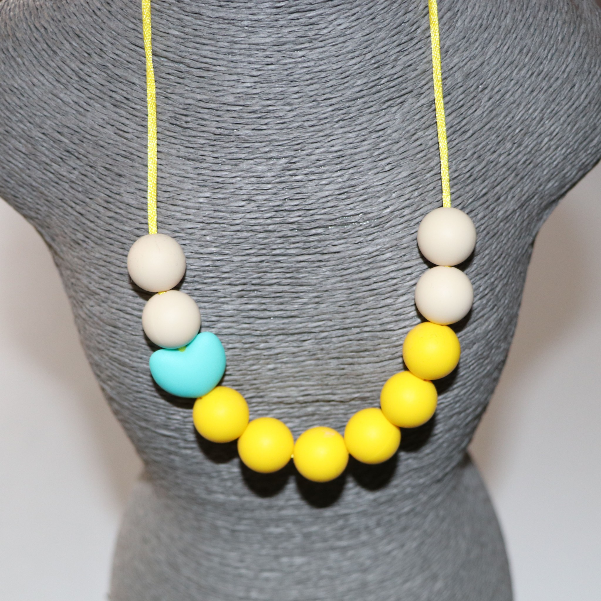 Ce collier permet des stimulations sensorielles orales, tactiles et visuelles de par ses textures, ses formes, ses couleurs.
