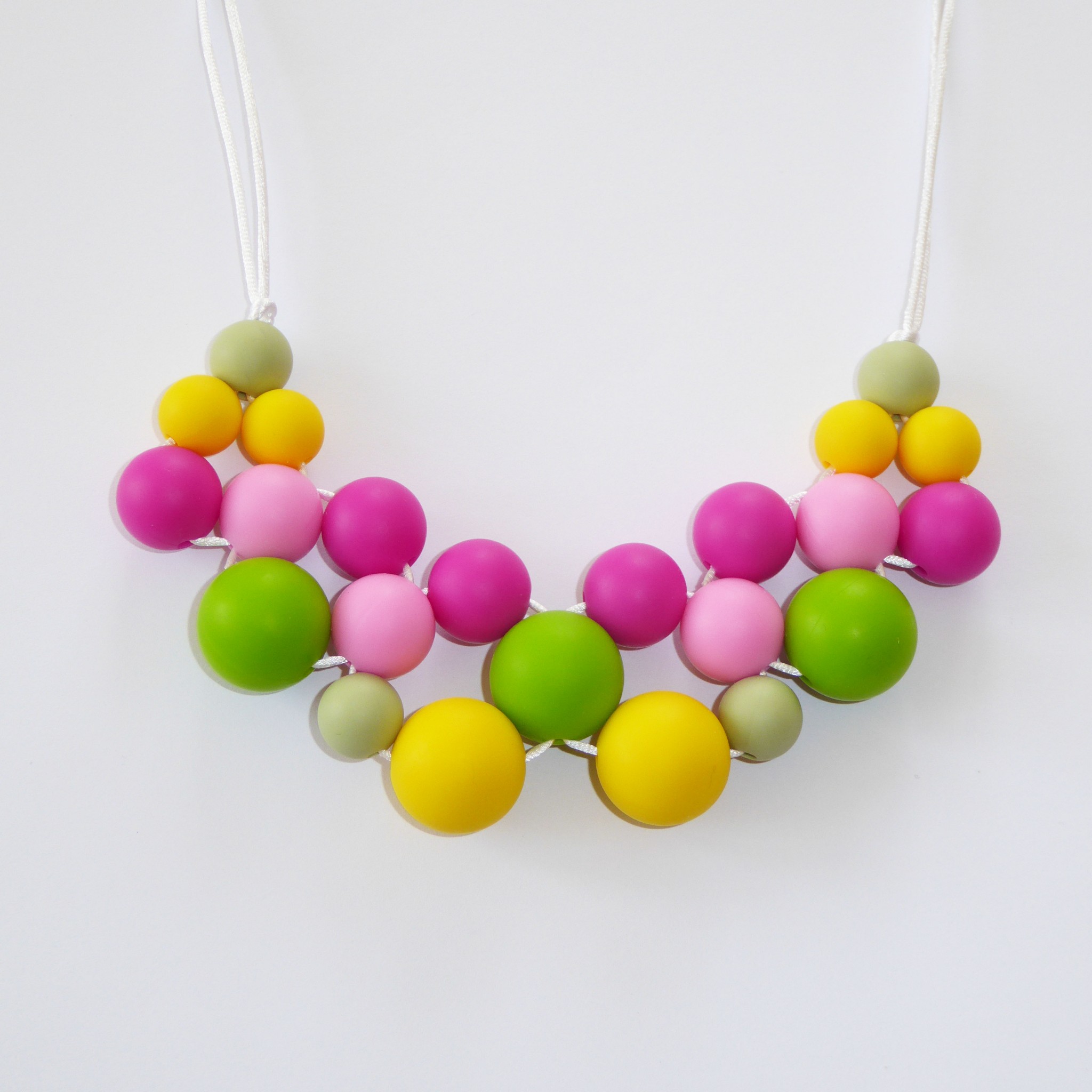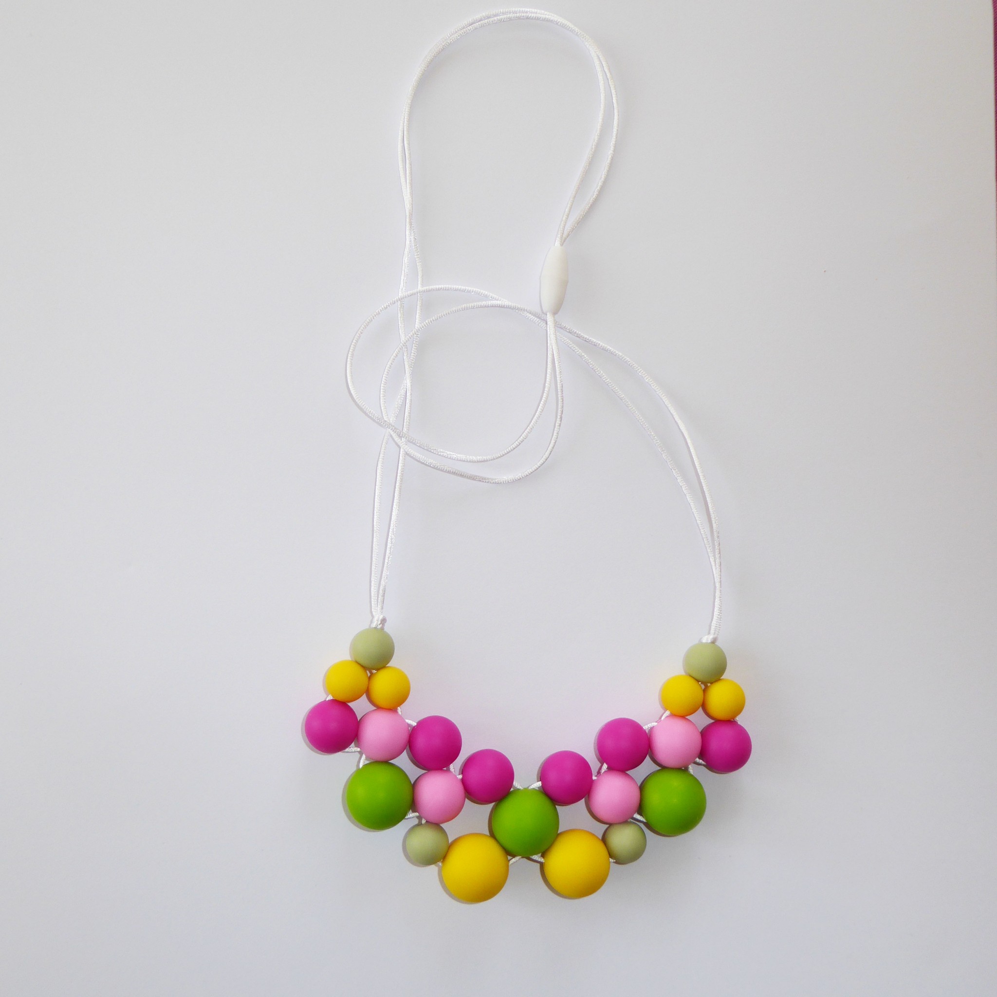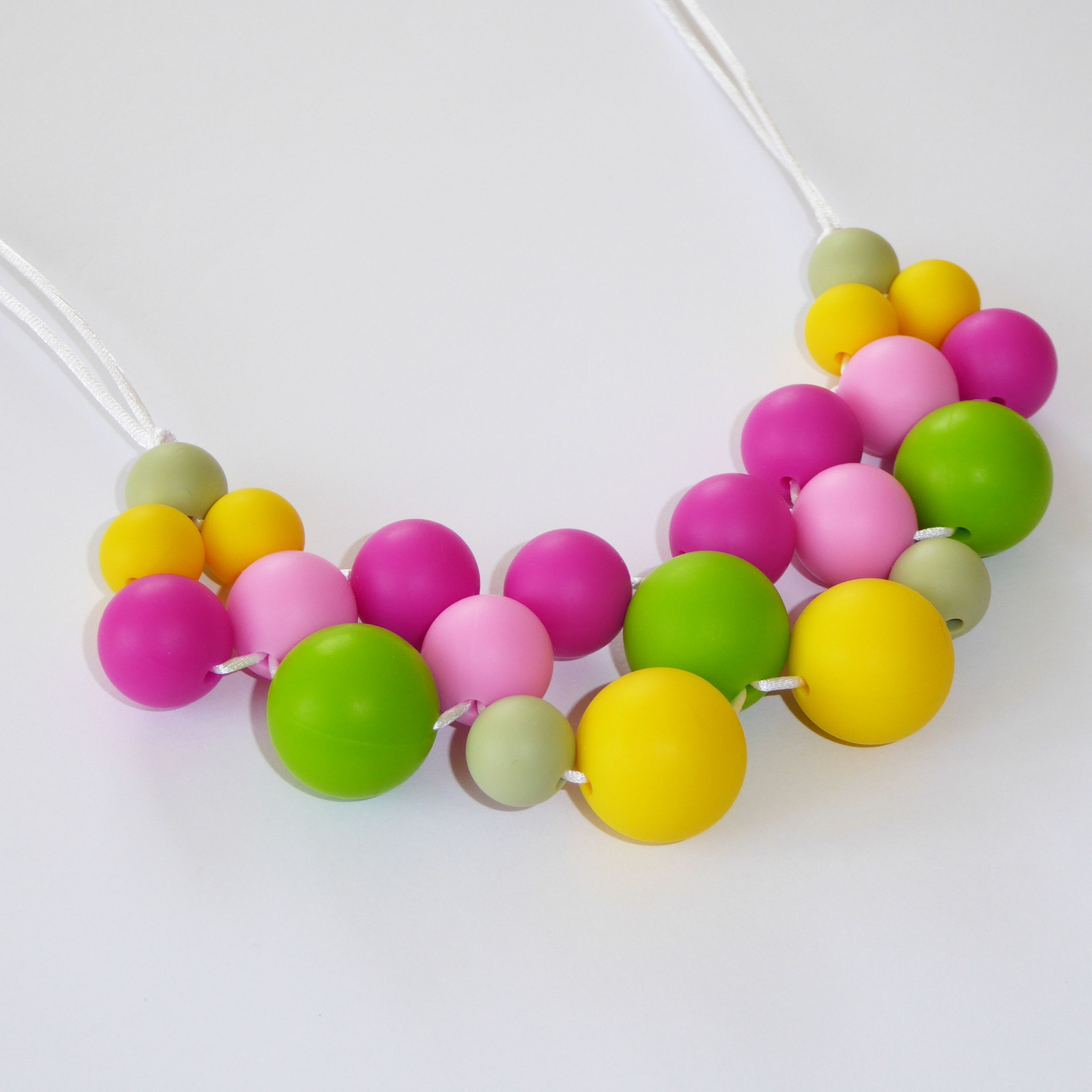 Ce collier permet des stimulations sensorielles orales, tactiles et visuelles de par ses textures, ses formes, ses couleurs.