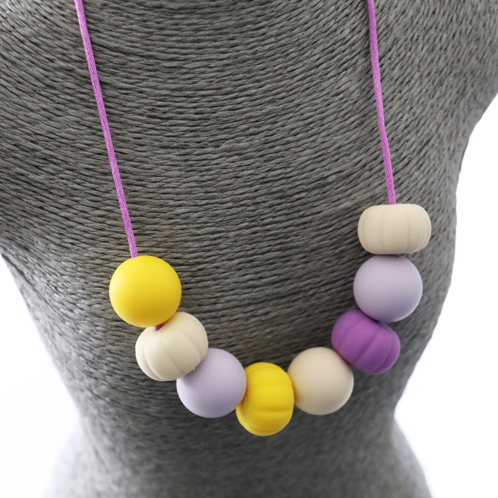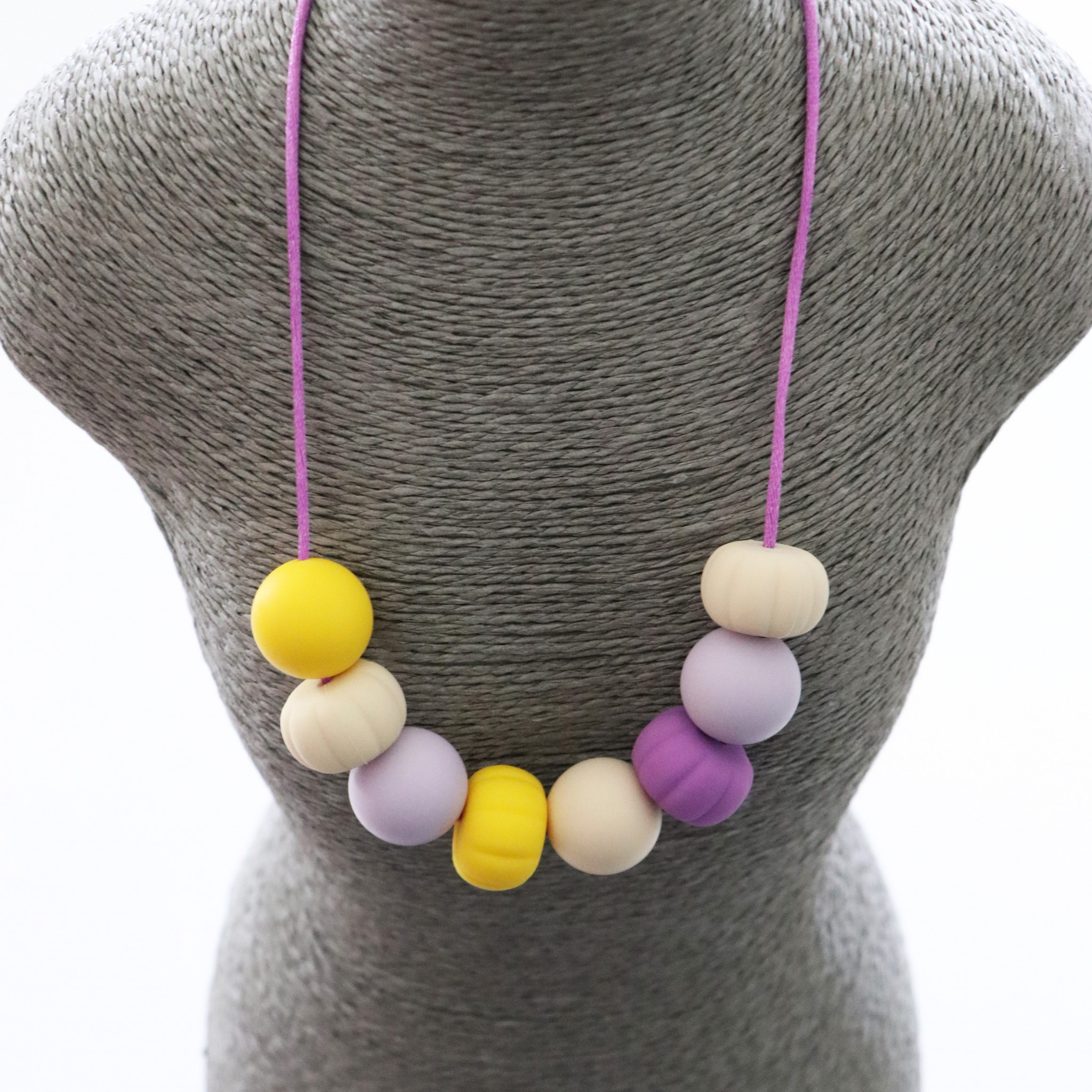 Ce collier permet des stimulations sensorielles orales, tactiles et visuelles de par ses textures, ses formes, ses couleurs.