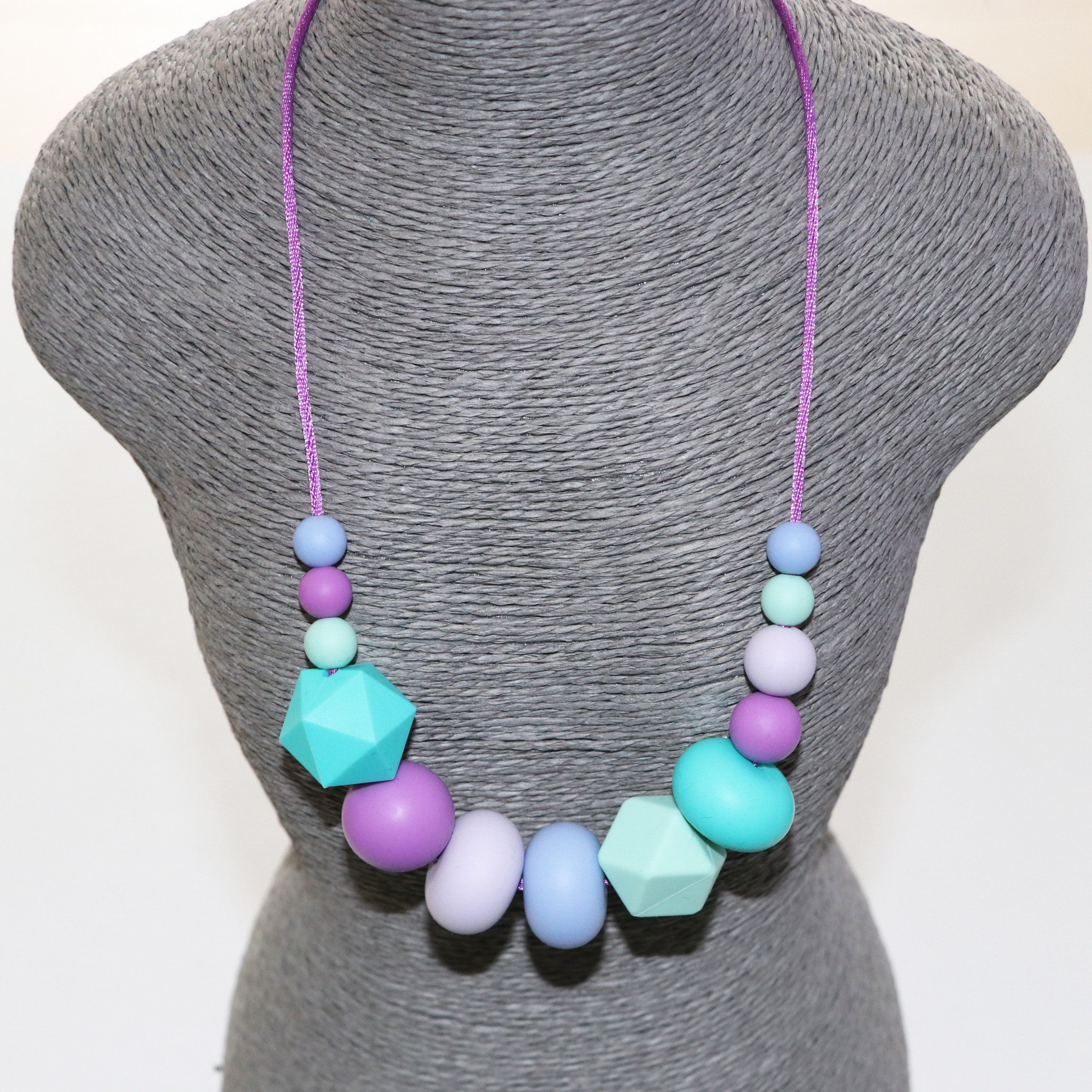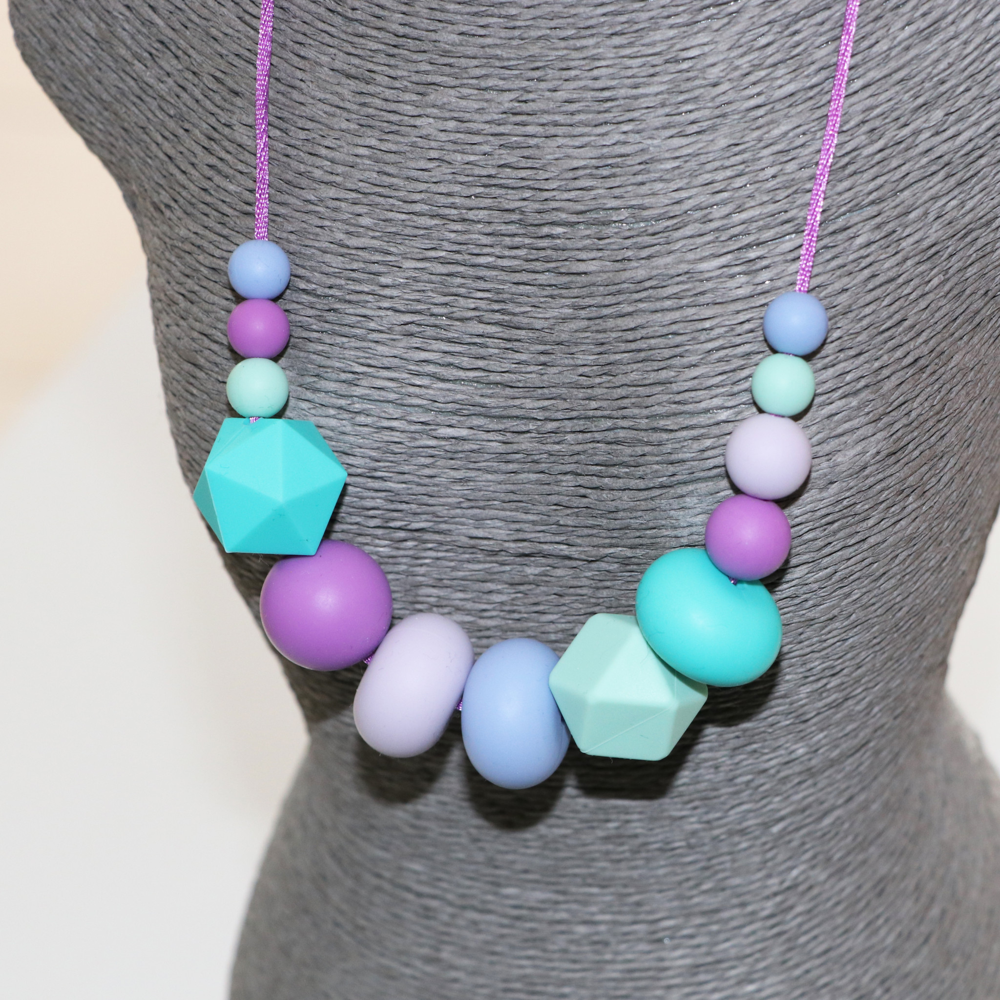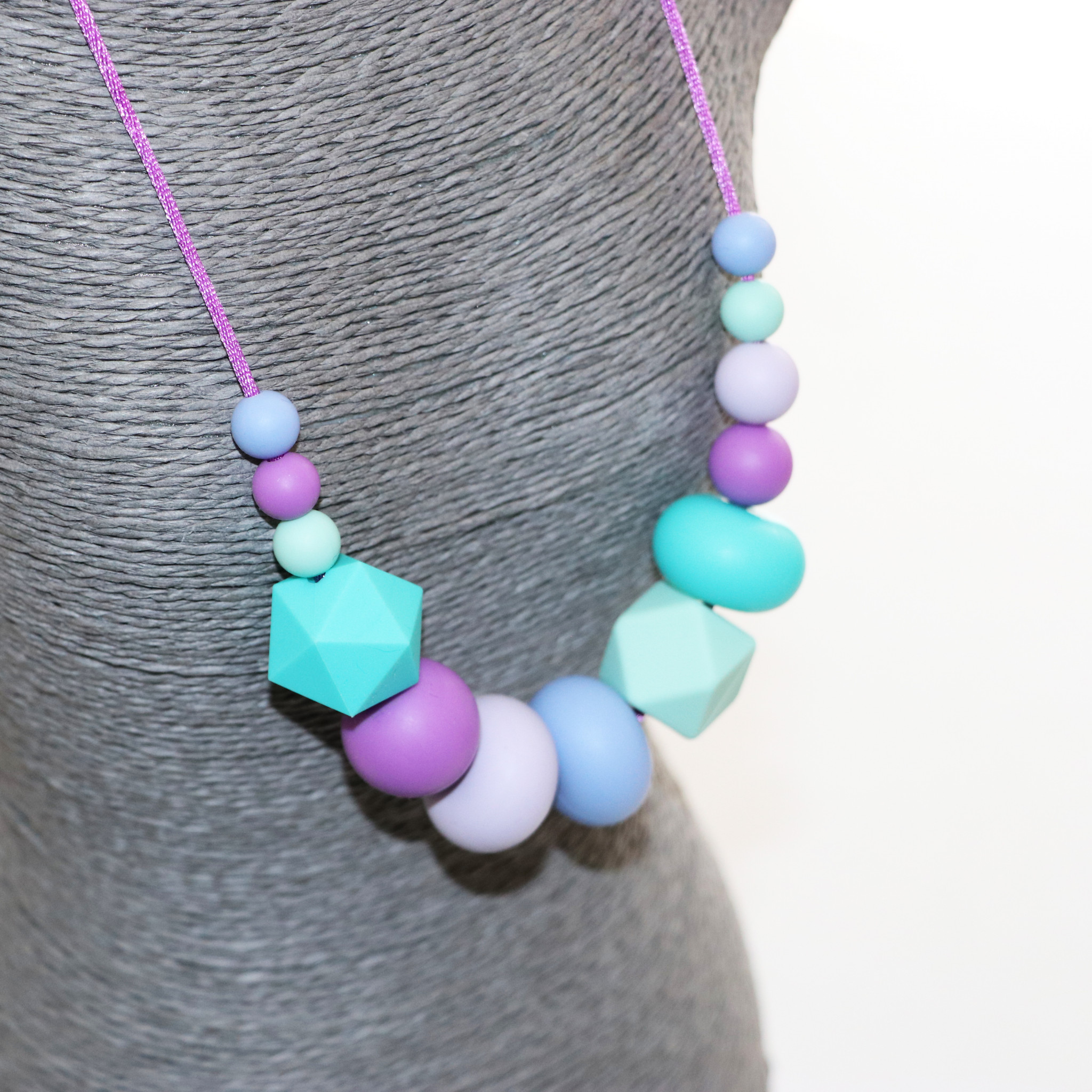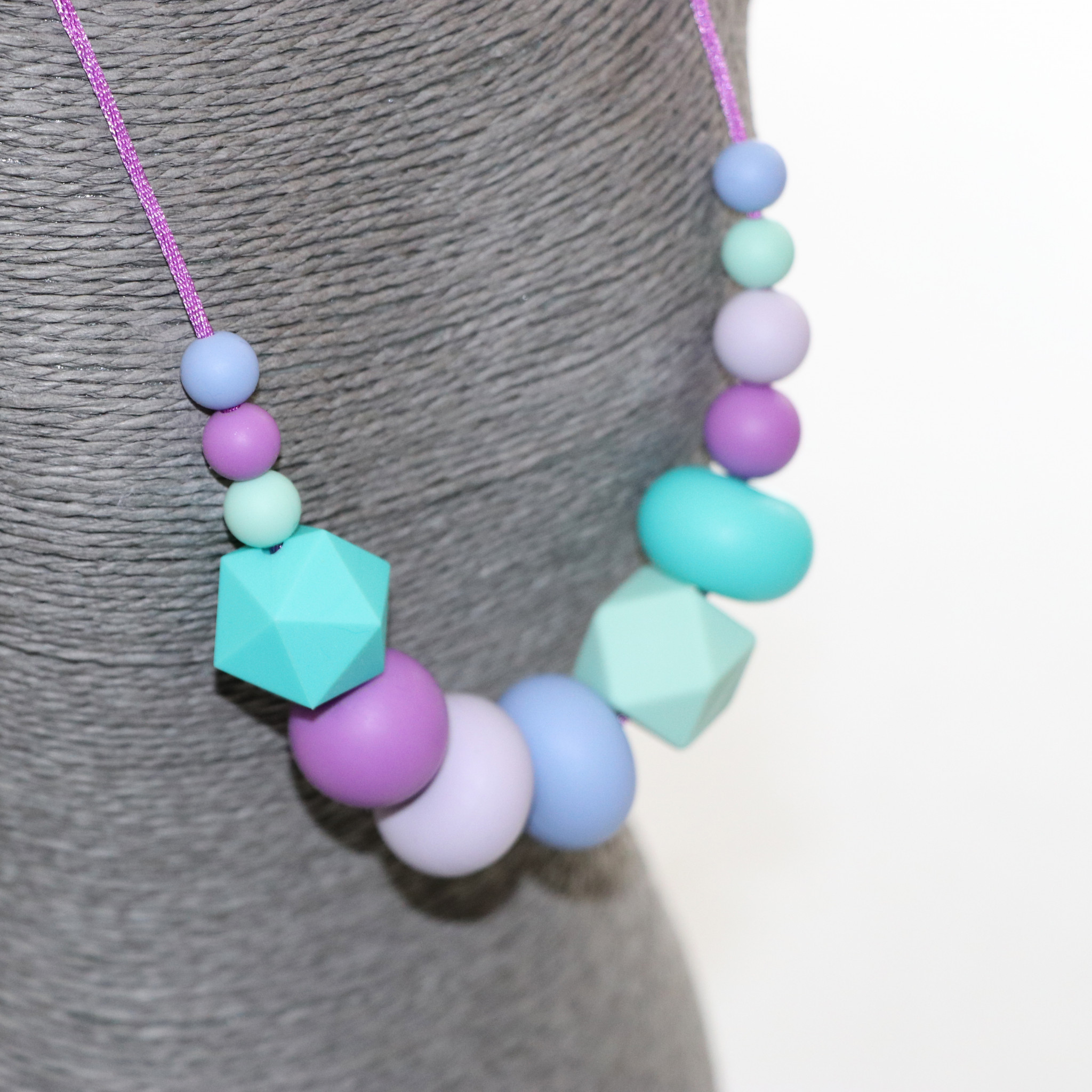 Ce collier permet des stimulations sensorielles orales, tactiles et visuelles de par ses textures, ses formes, ses couleurs.