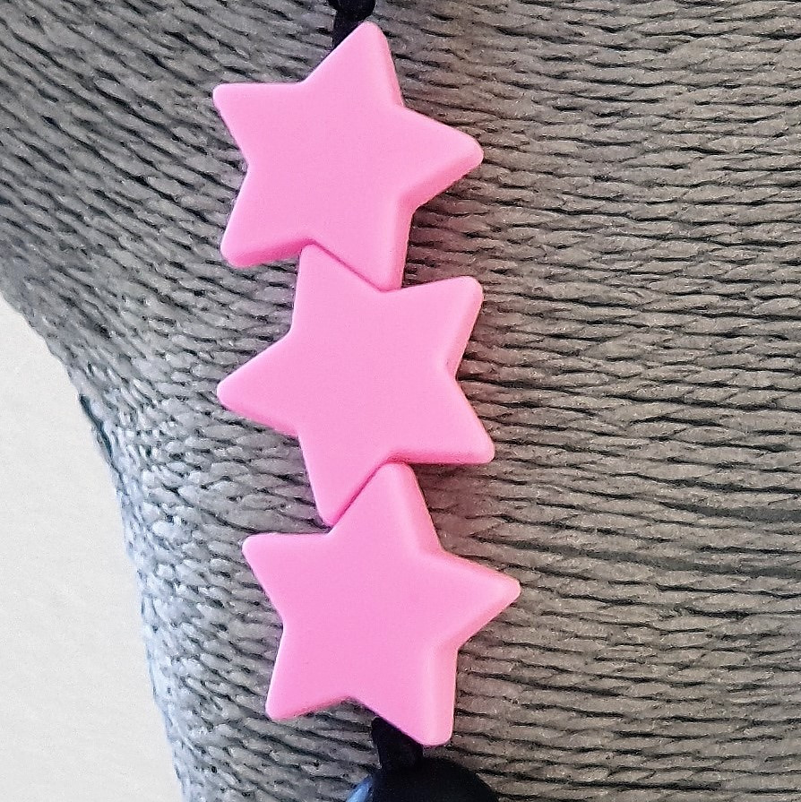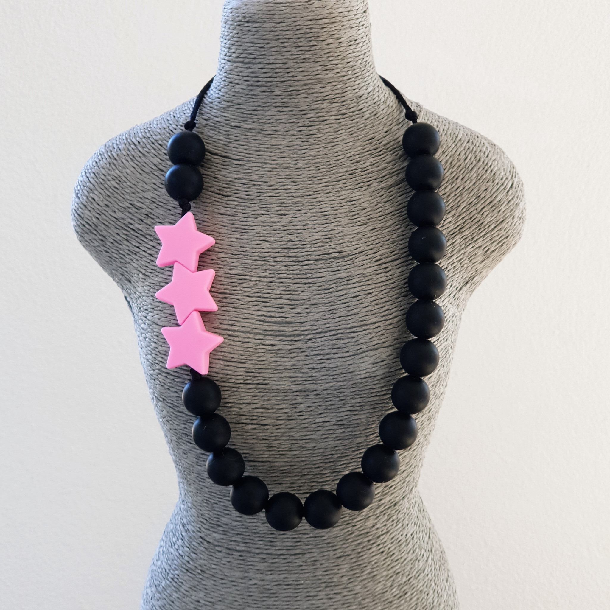 Ce collier permet des stimulations sensorielles orales, tactiles et visuelles de par ses textures, ses formes, ses couleurs.