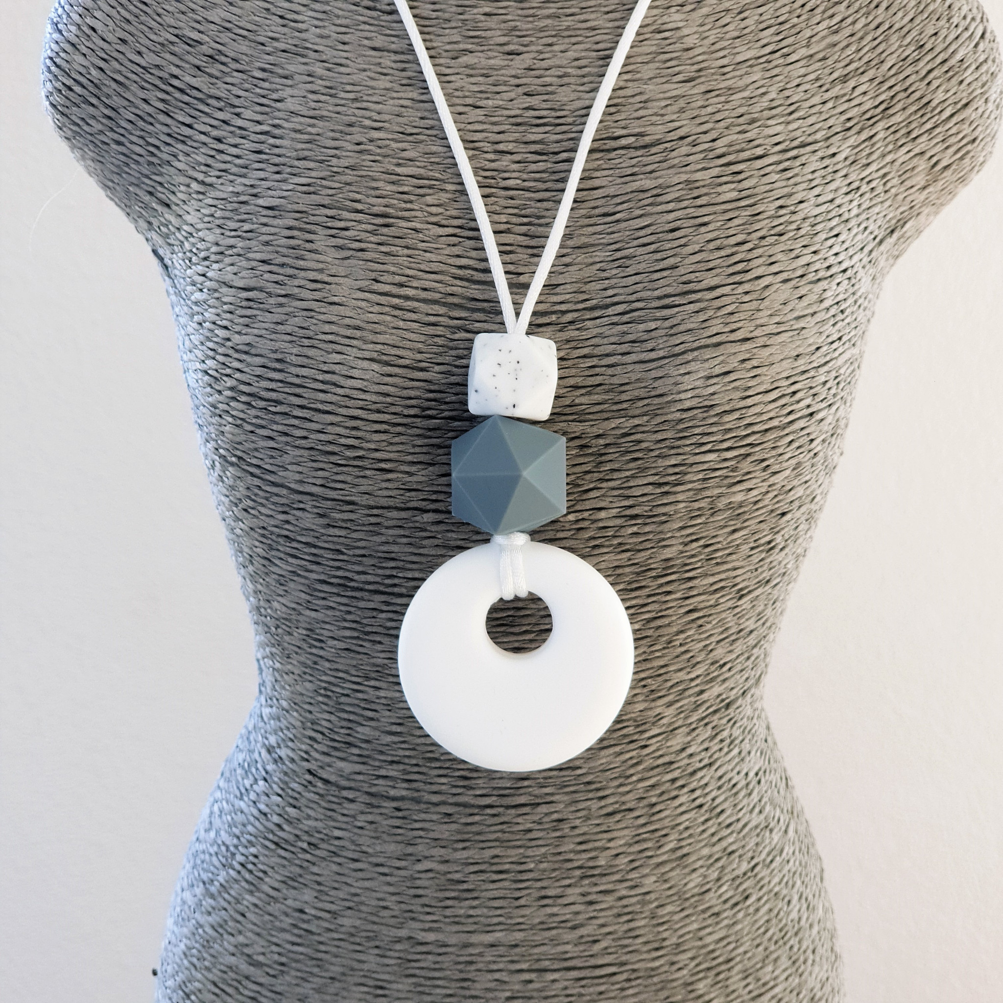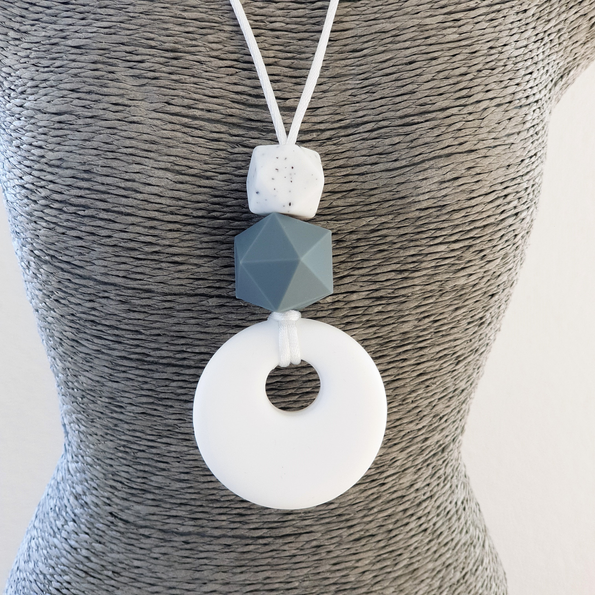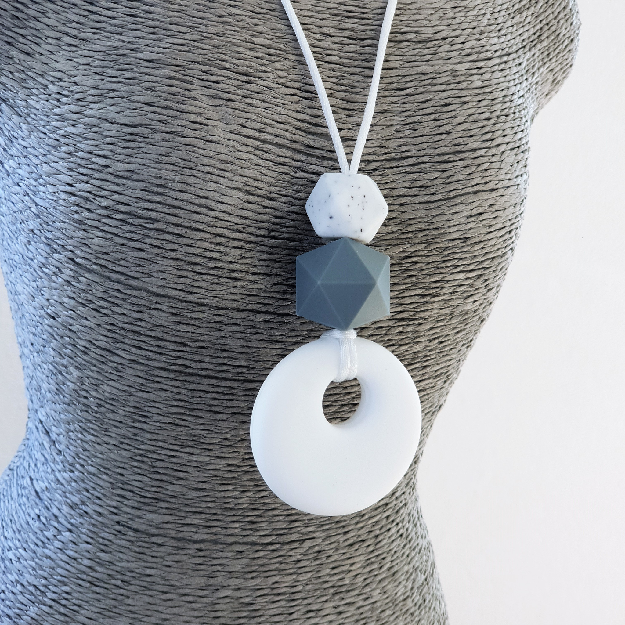 Ce collier permet des stimulations sensorielles orales, tactiles et visuelles de par ses textures, ses formes, ses couleurs.