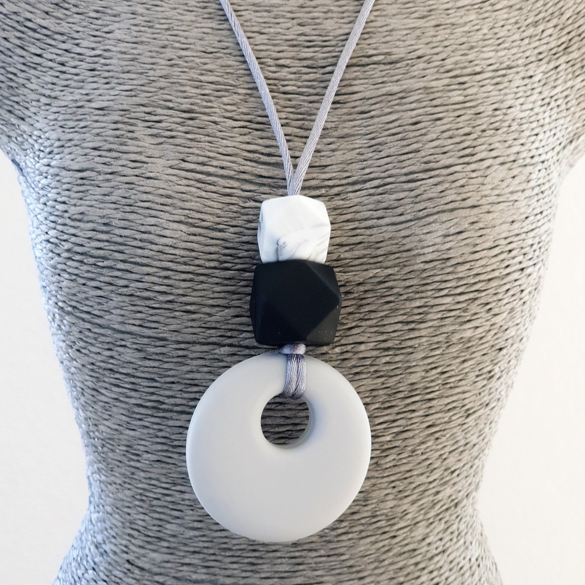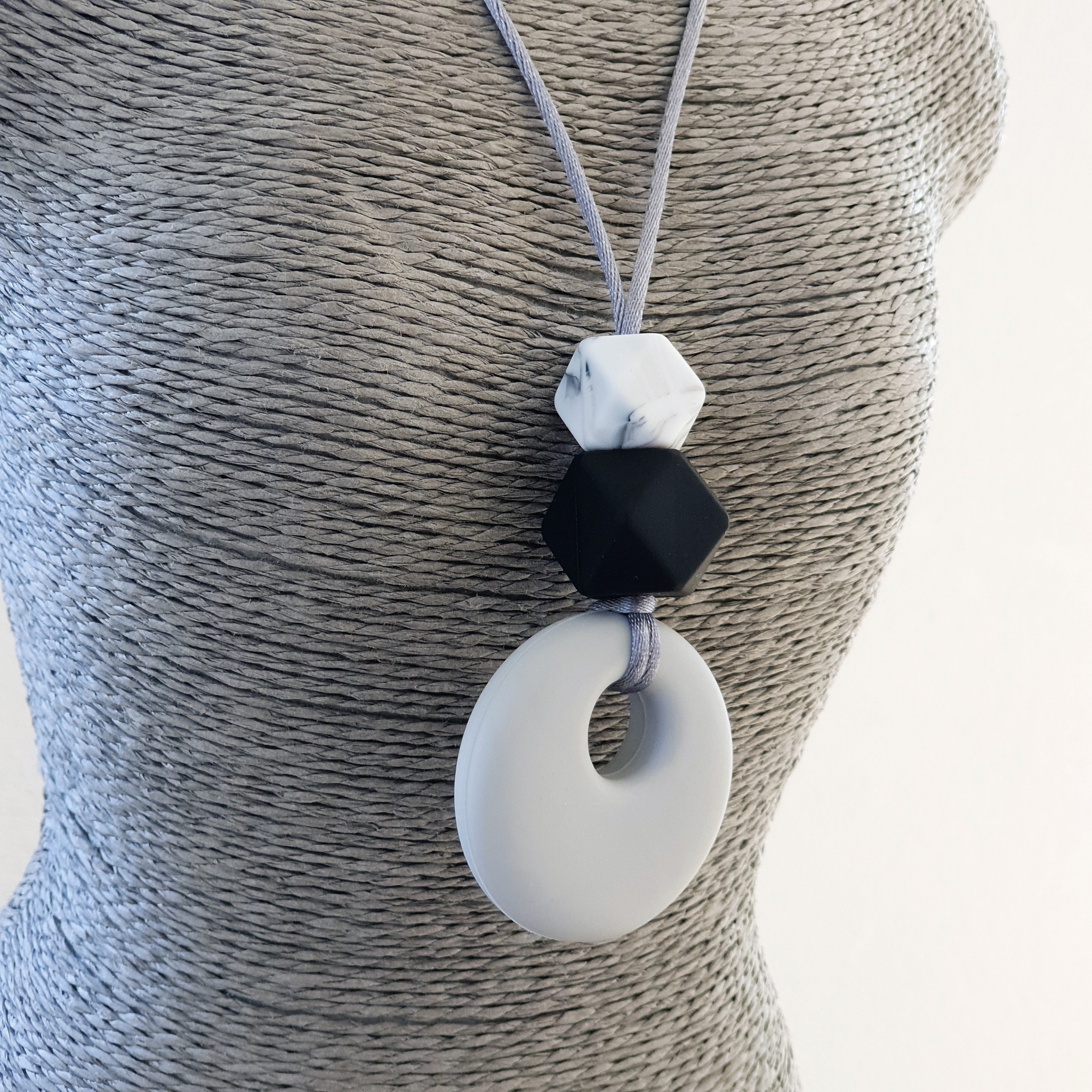 Ce collier permet des stimulations sensorielles orales, tactiles et visuelles de par ses textures, ses formes, ses couleurs.