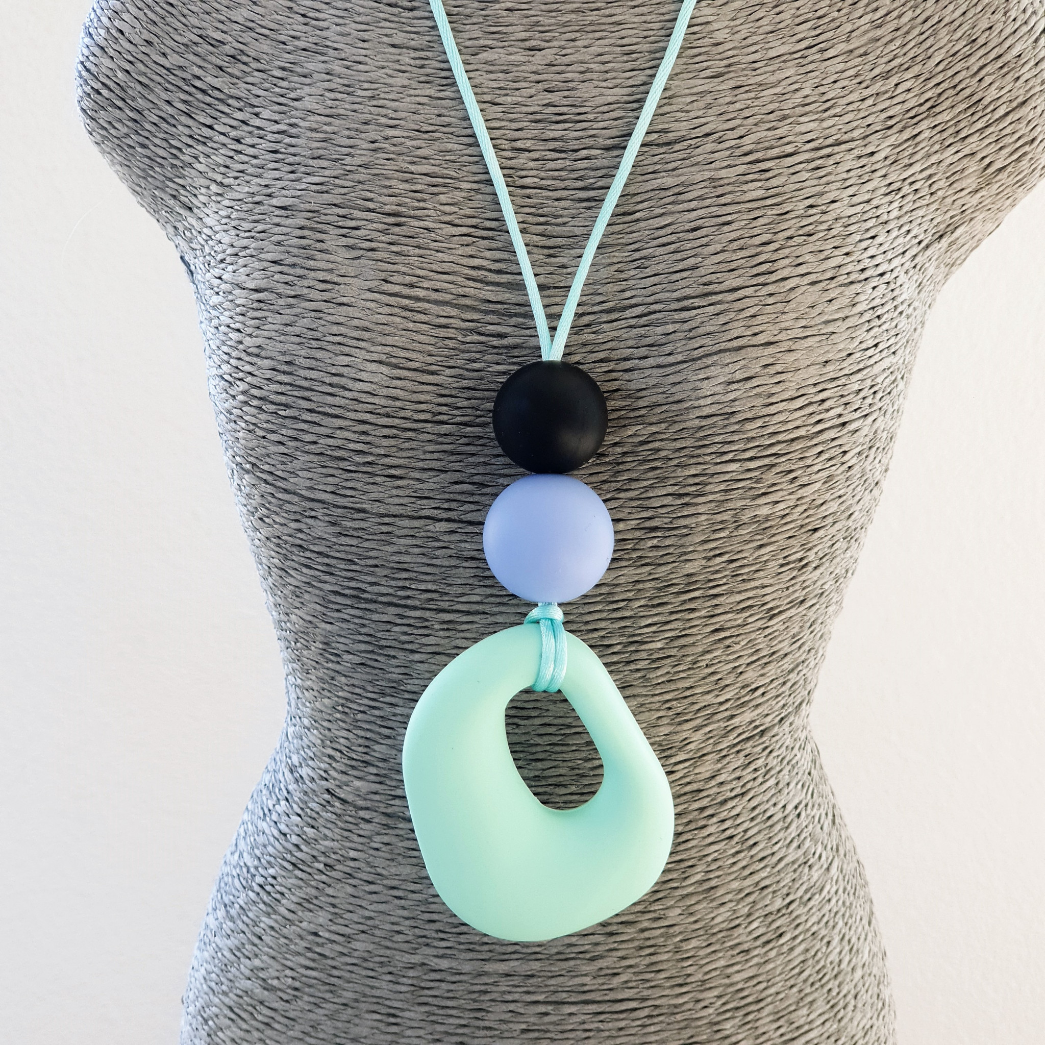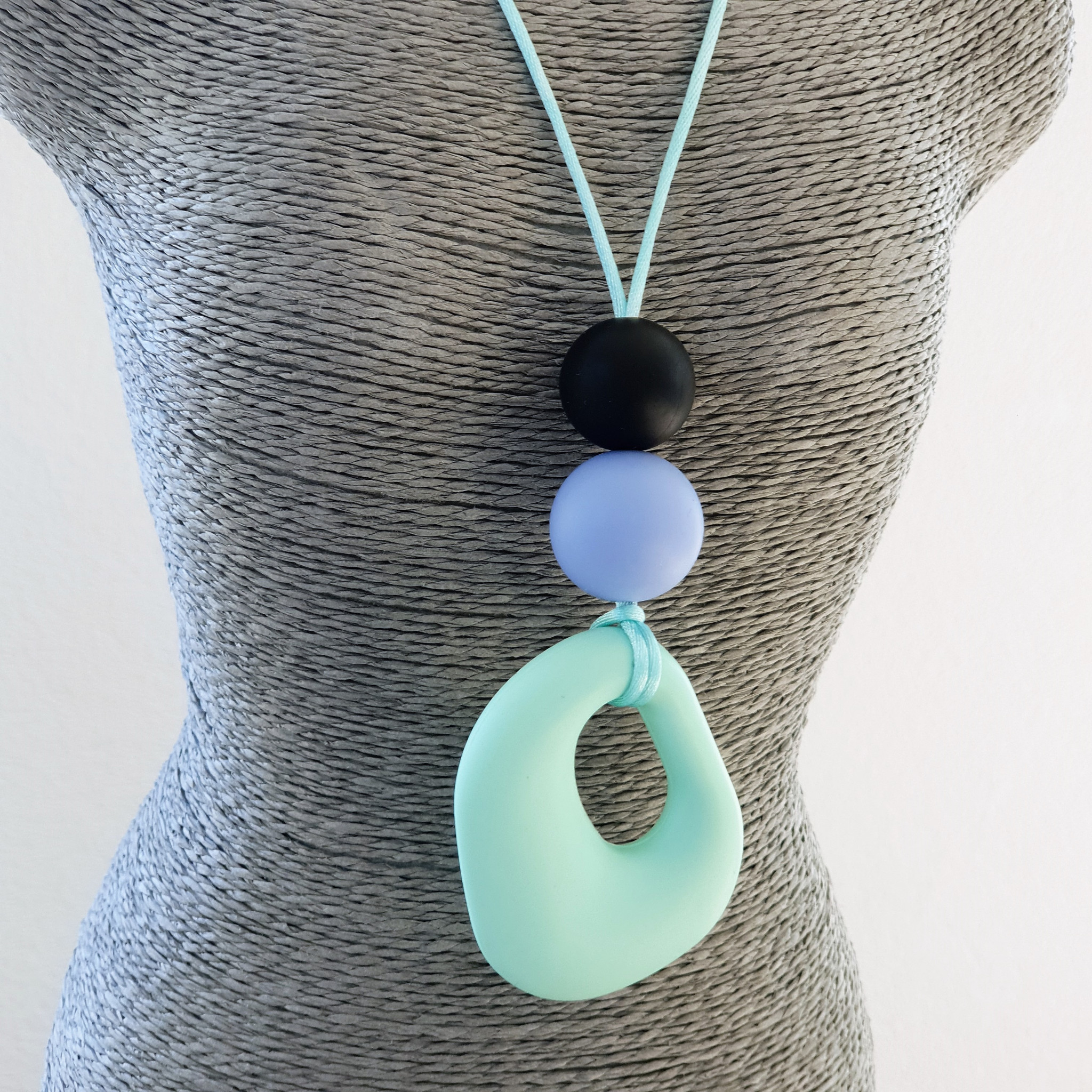 Ce collier permet des stimulations sensorielles orales, tactiles et visuelles de par ses textures, ses formes, ses couleurs.