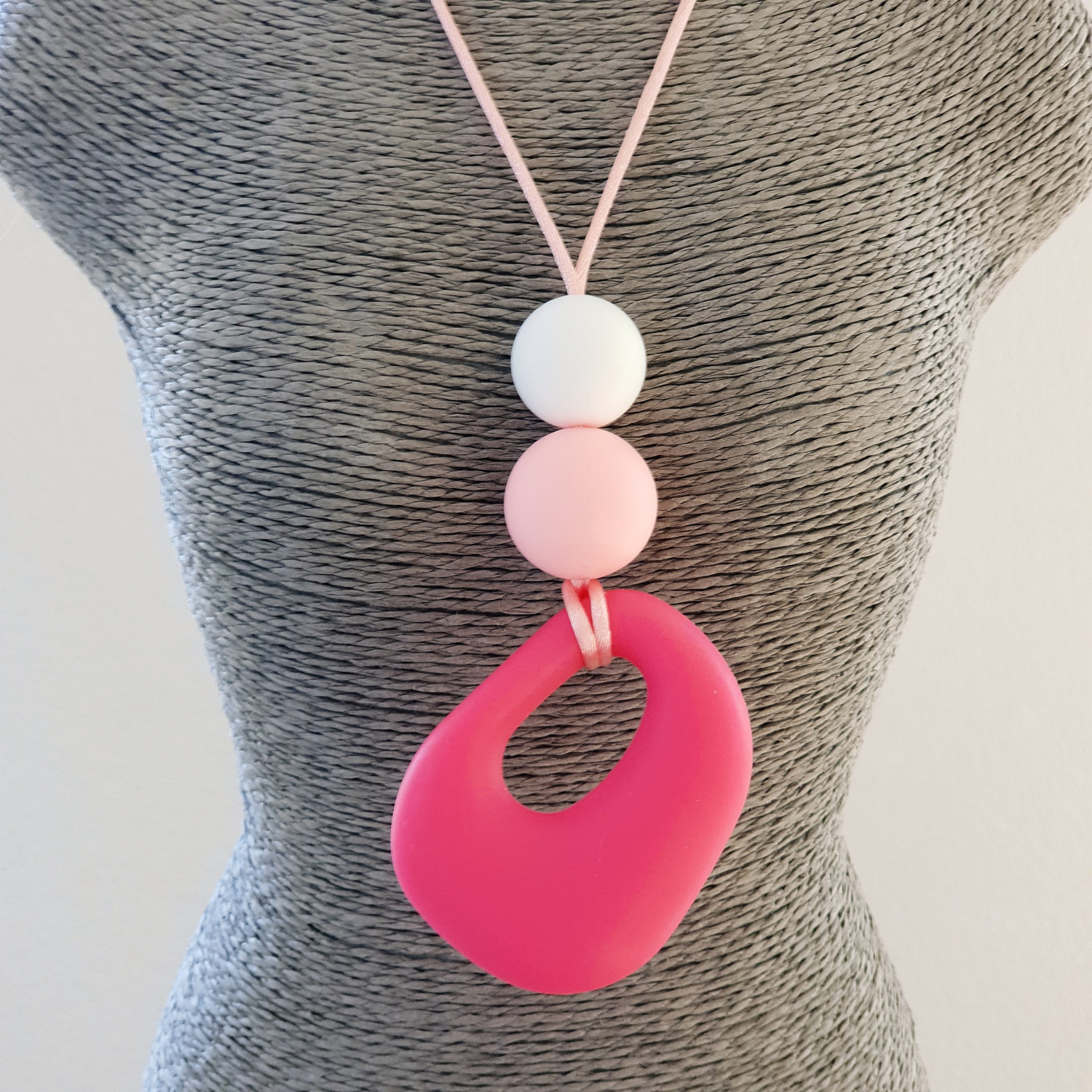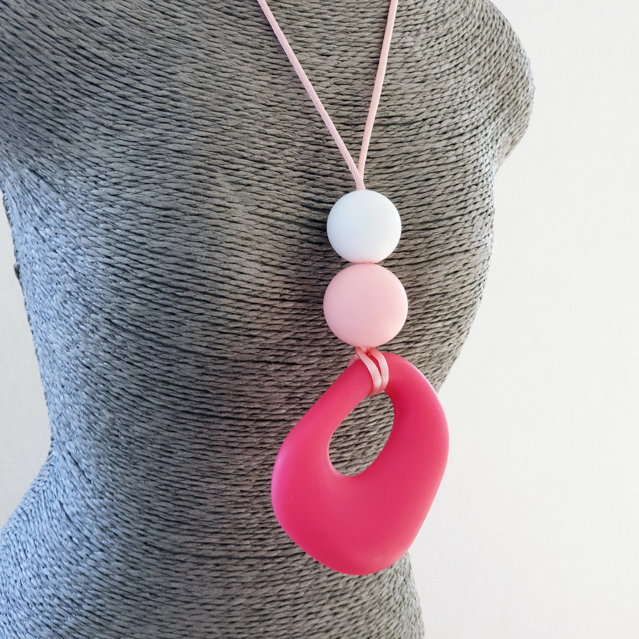 Ce collier permet des stimulations sensorielles orales, tactiles et visuelles de par ses textures, ses formes, ses couleurs.