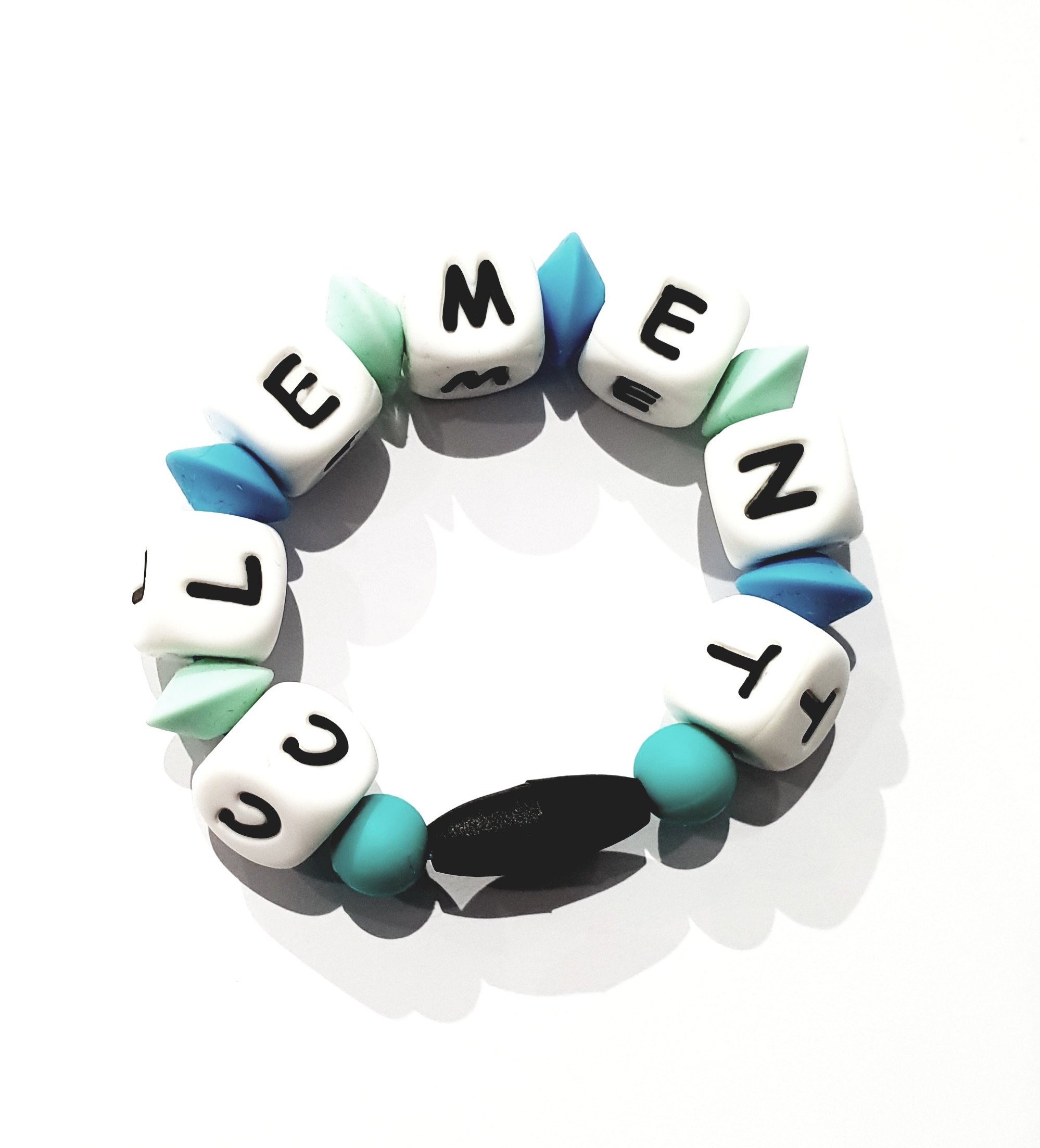 Ce collier permet des stimulations sensorielles orales, tactiles et visuelles de par ses textures, ses formes, ses couleurs.