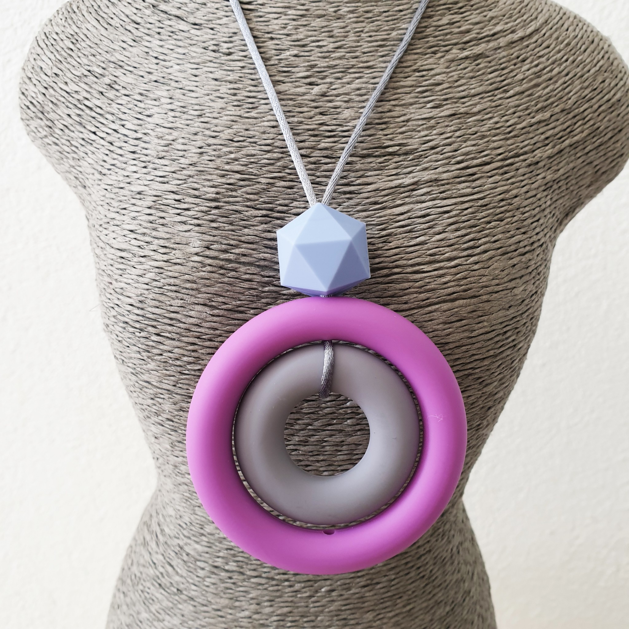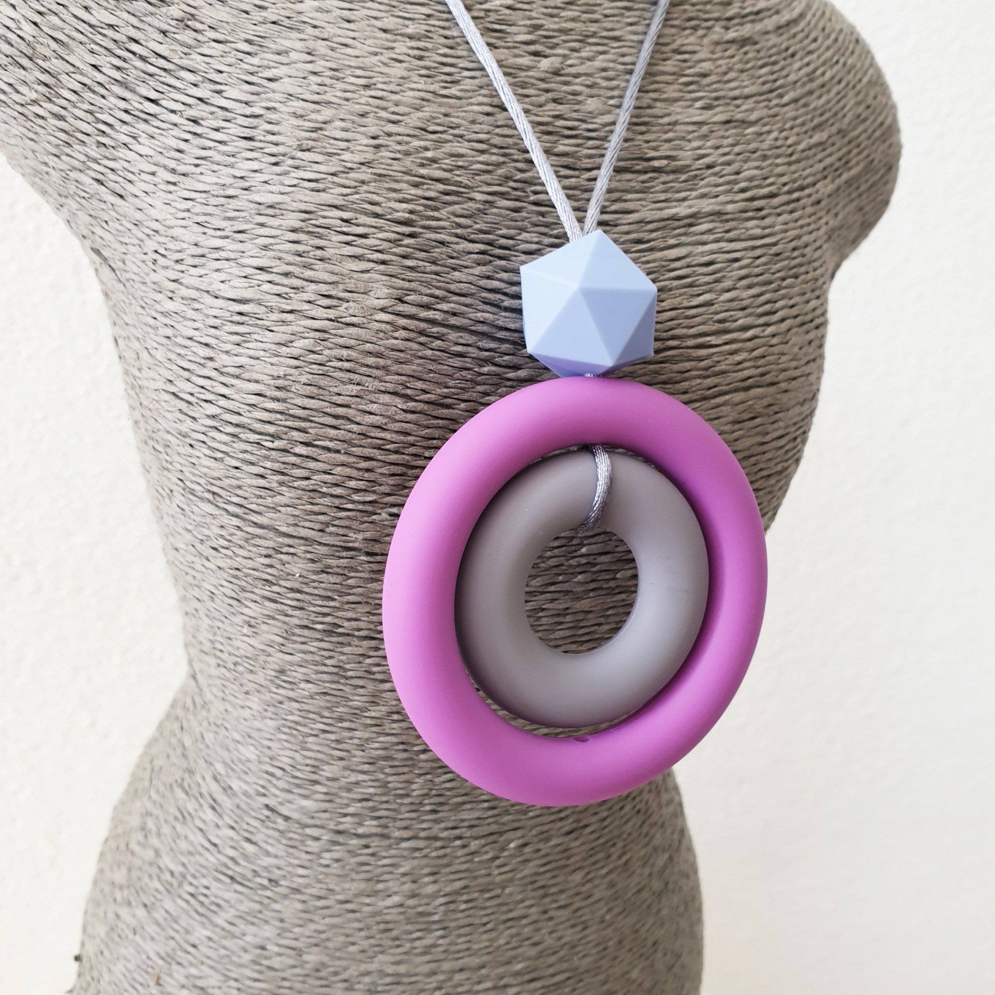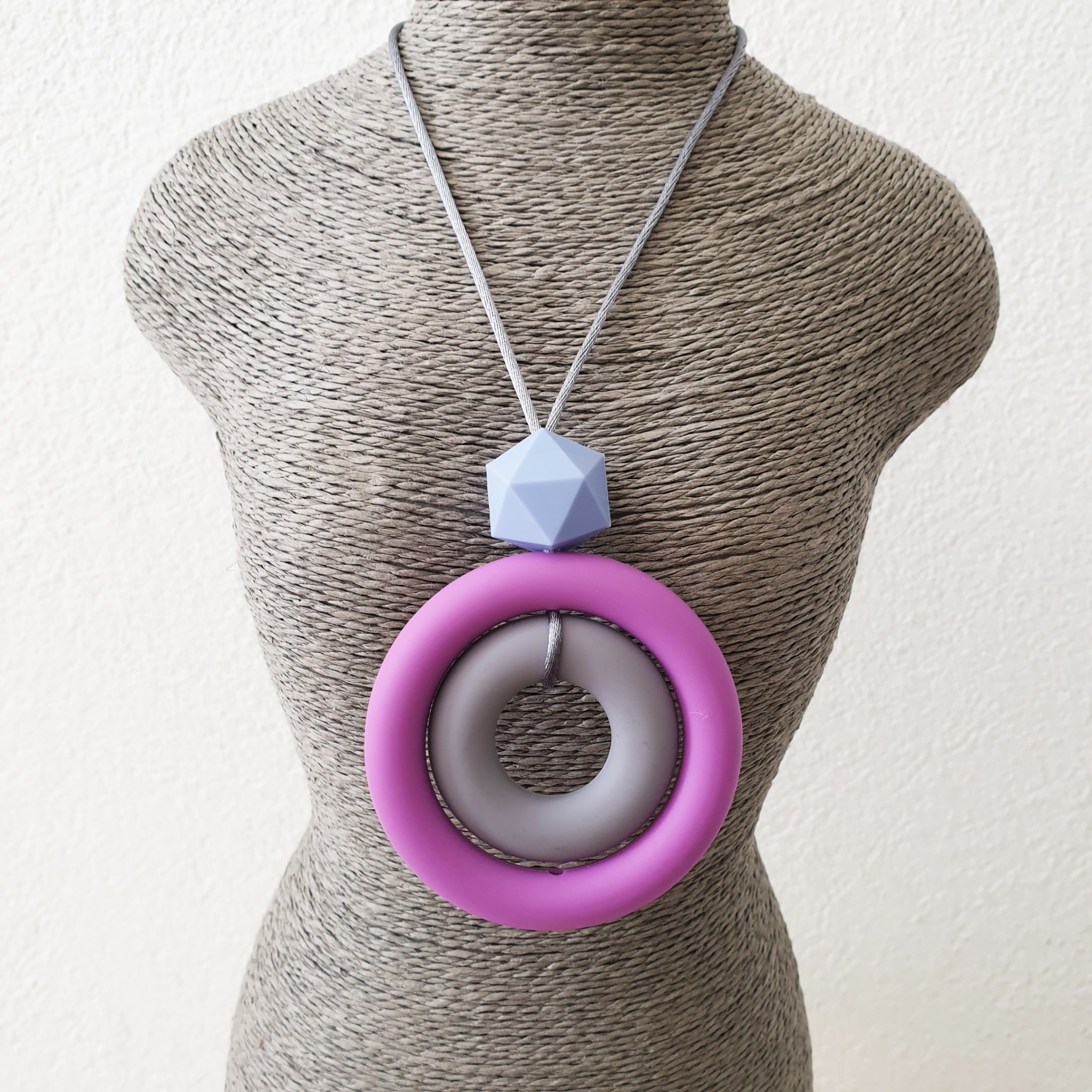Ce collier permet des stimulations sensorielles orales, tactiles et visuelles de par ses textures, ses formes, ses couleurs.