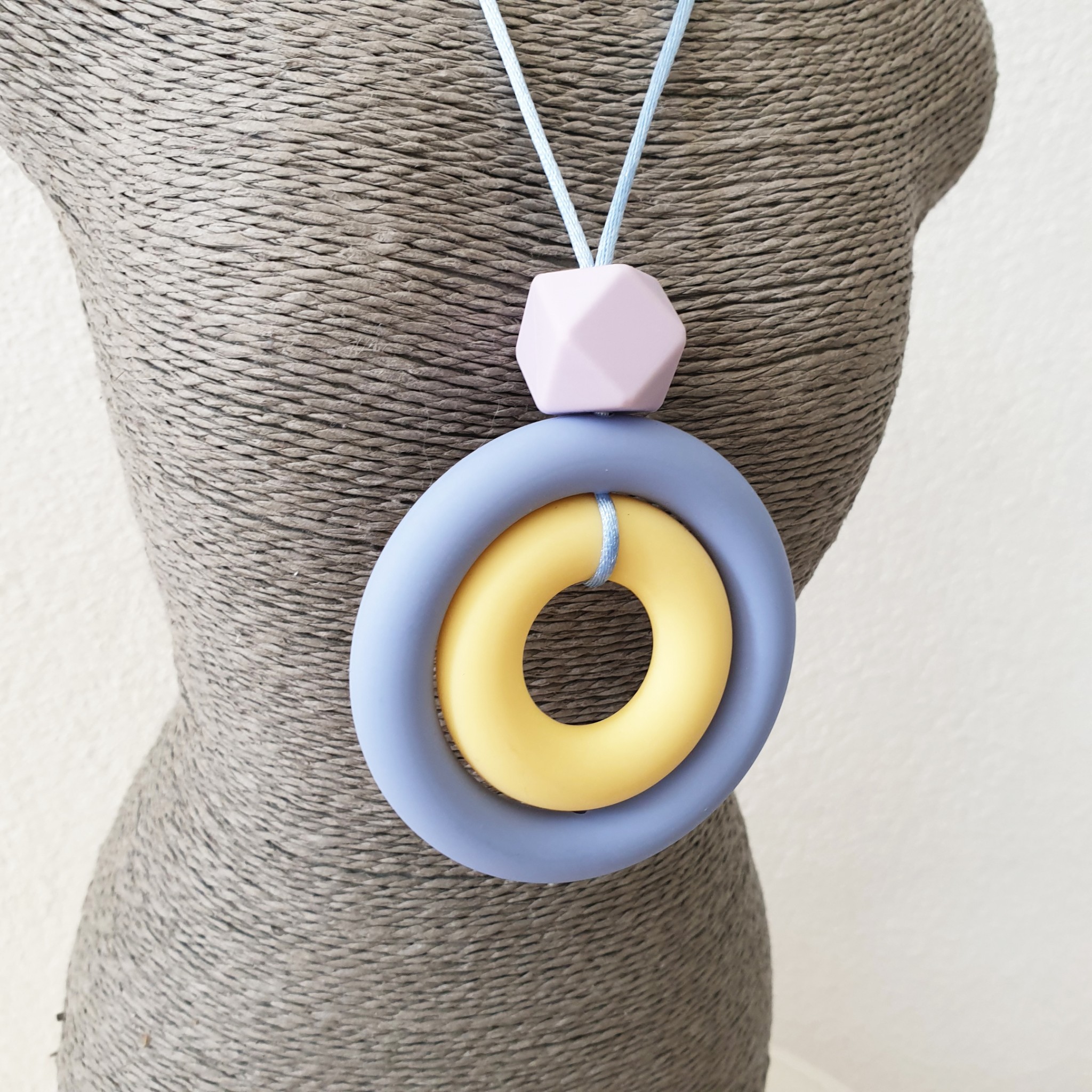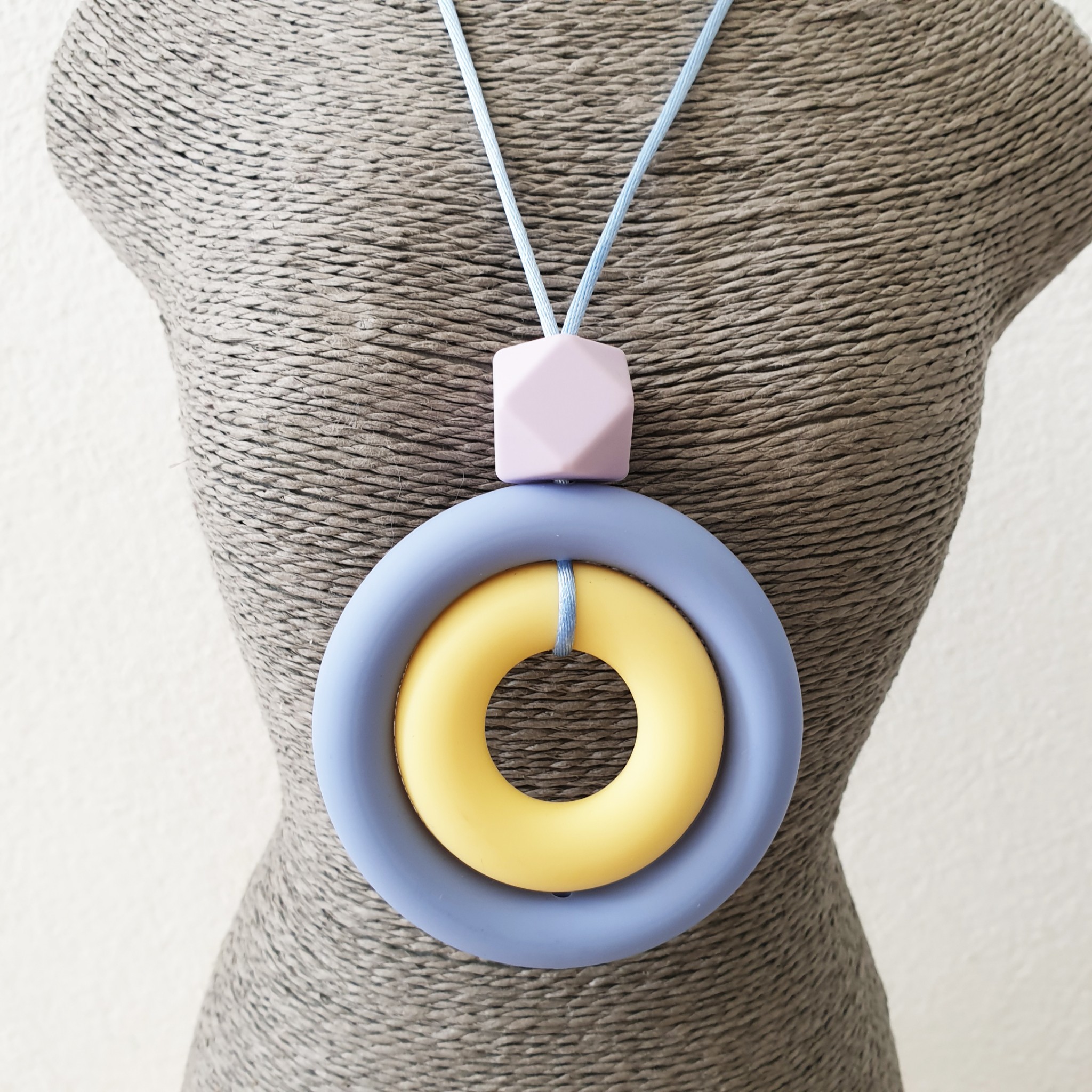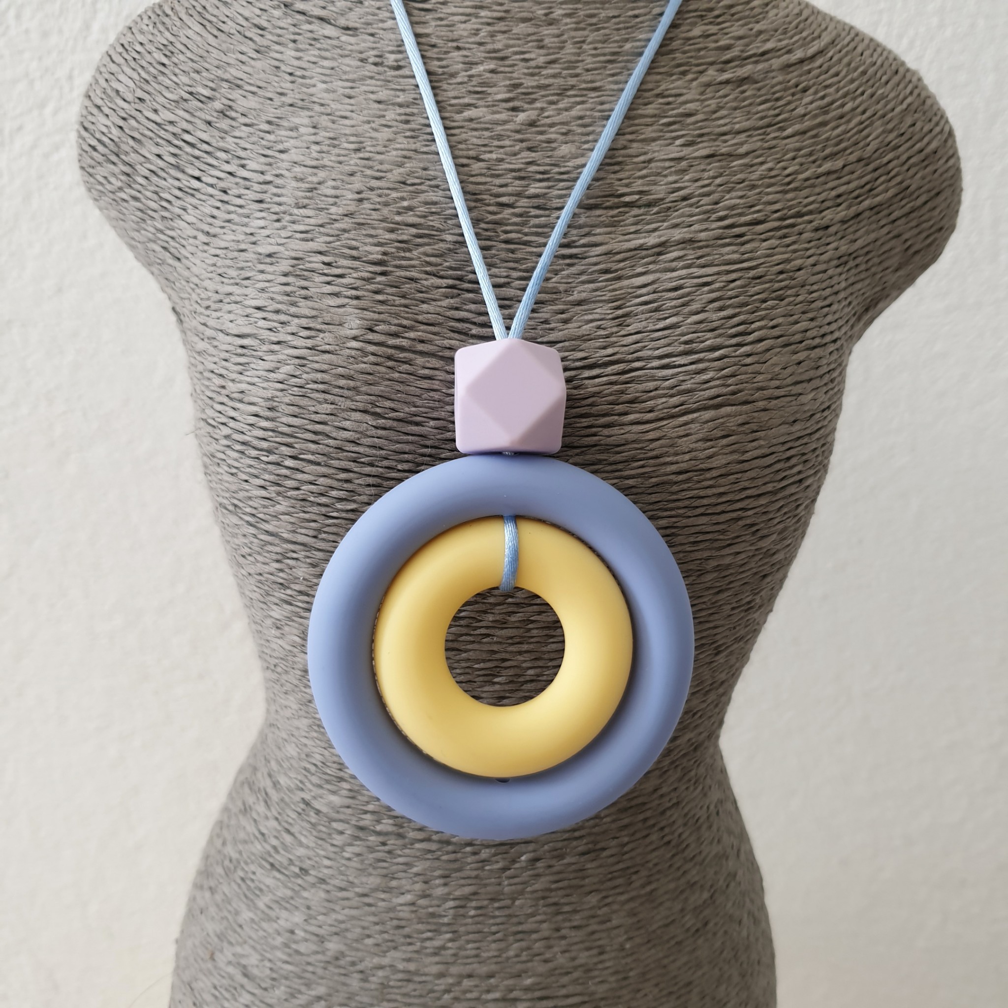 Ce collier permet des stimulations sensorielles orales, tactiles et visuelles de par ses textures, ses formes, ses couleurs.