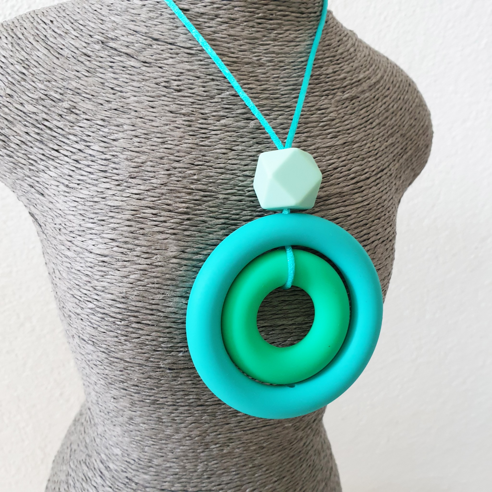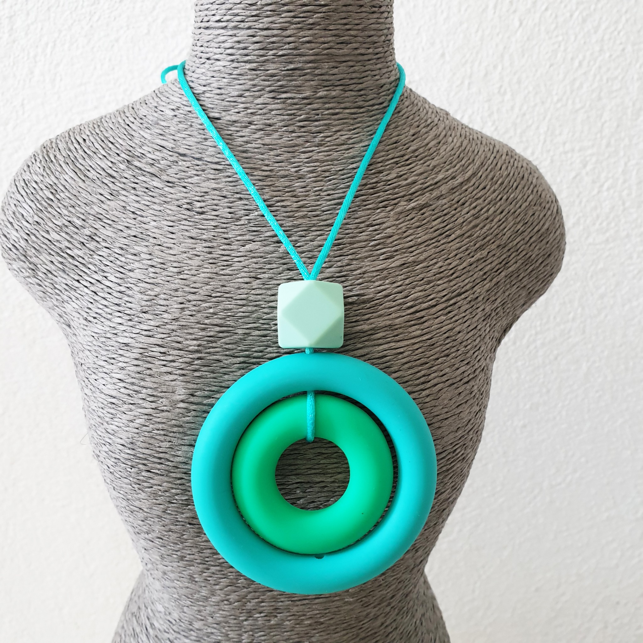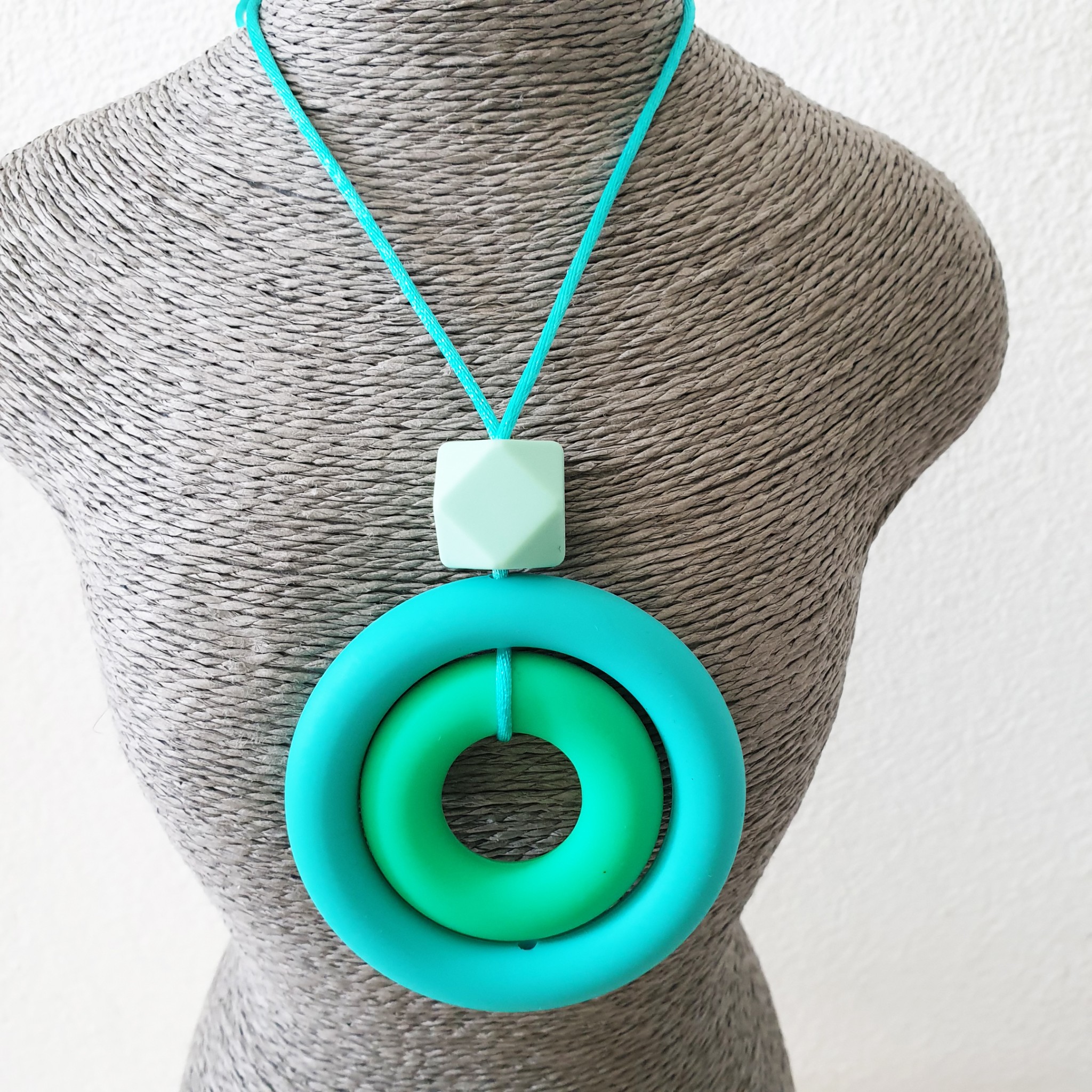 Ce collier permet des stimulations sensorielles orales, tactiles et visuelles de par ses textures, ses formes, ses couleurs.