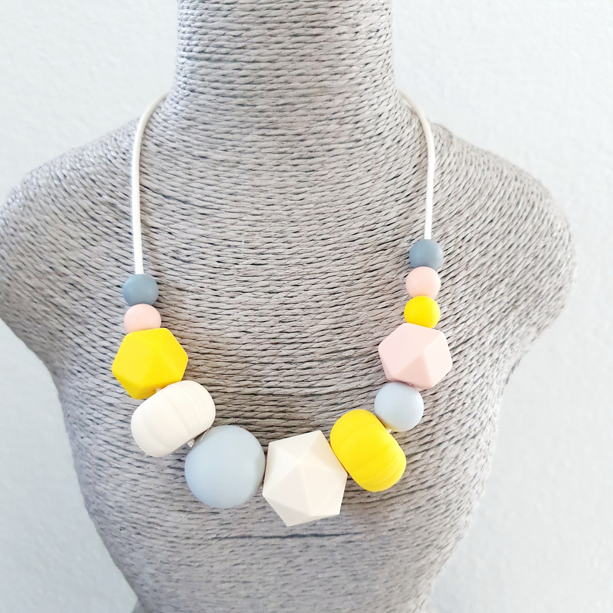 Ce collier permet des stimulations sensorielles orales, tactiles et visuelles de par ses textures, ses formes, ses couleurs.