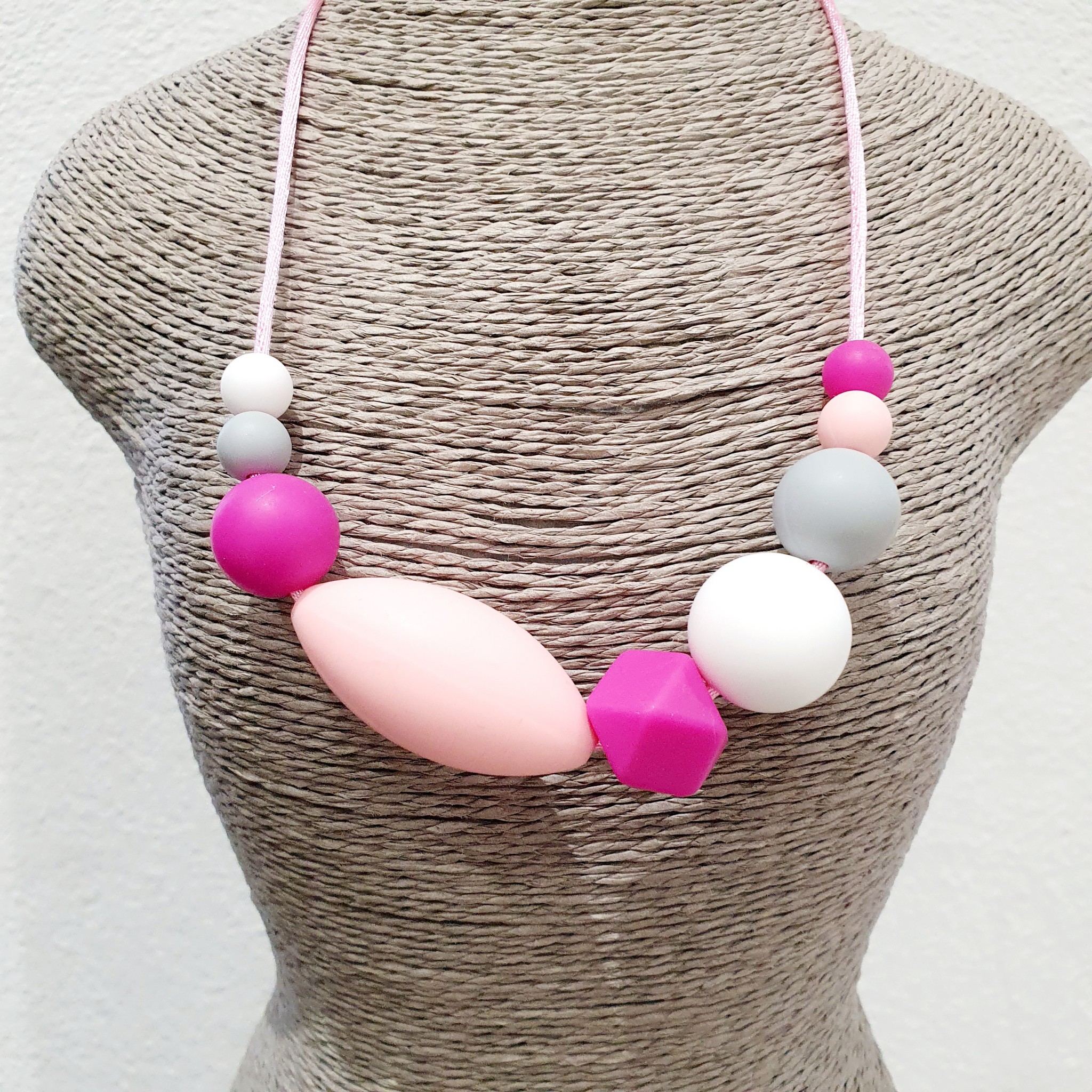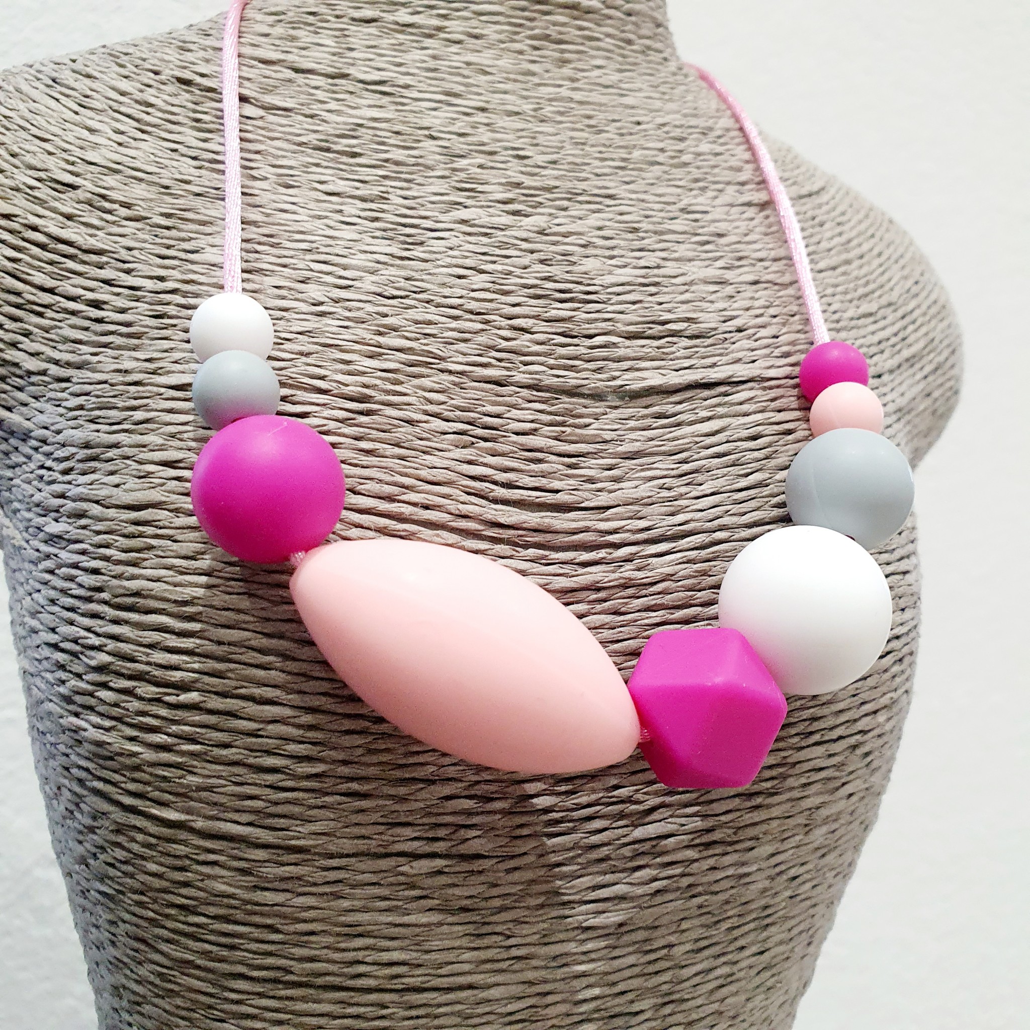 Ce collier permet des stimulations sensorielles orales, tactiles et visuelles de par ses textures, ses formes, ses couleurs.
