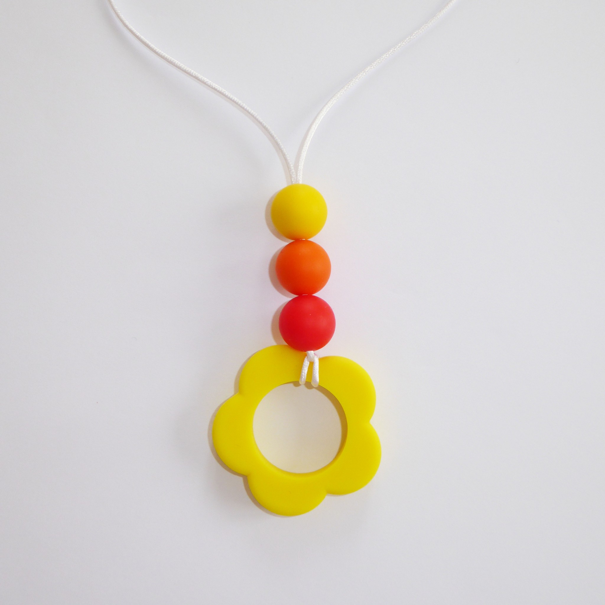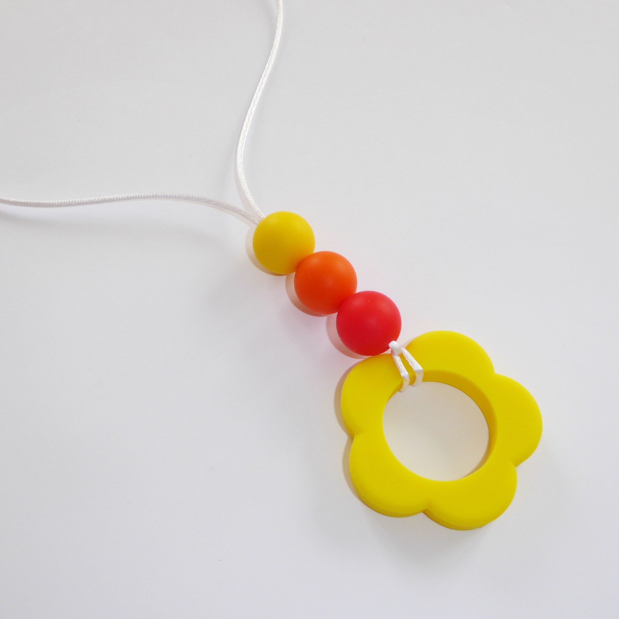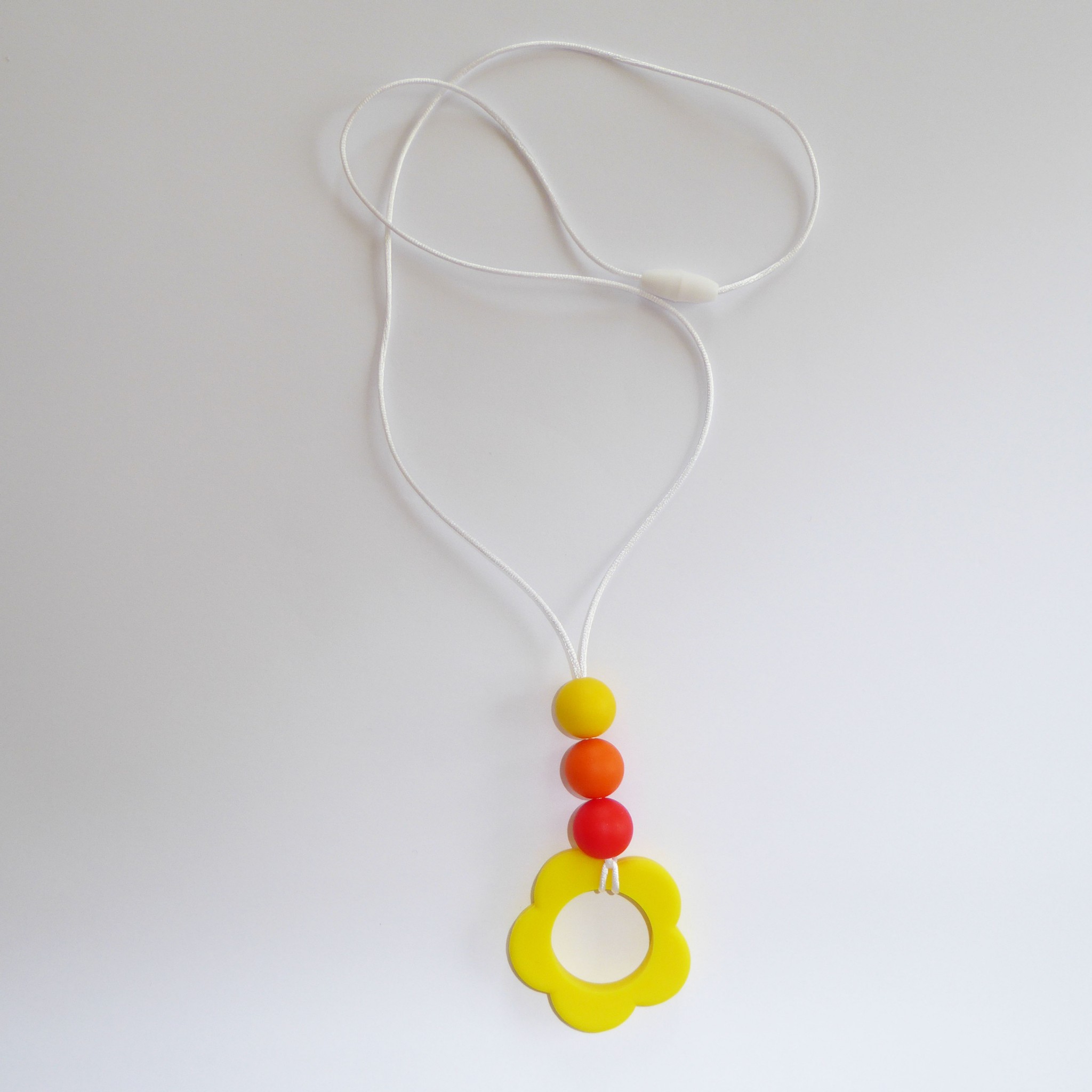 Ce collier permet des stimulations sensorielles orales, tactiles et visuelles de par ses textures, ses formes, ses couleurs.