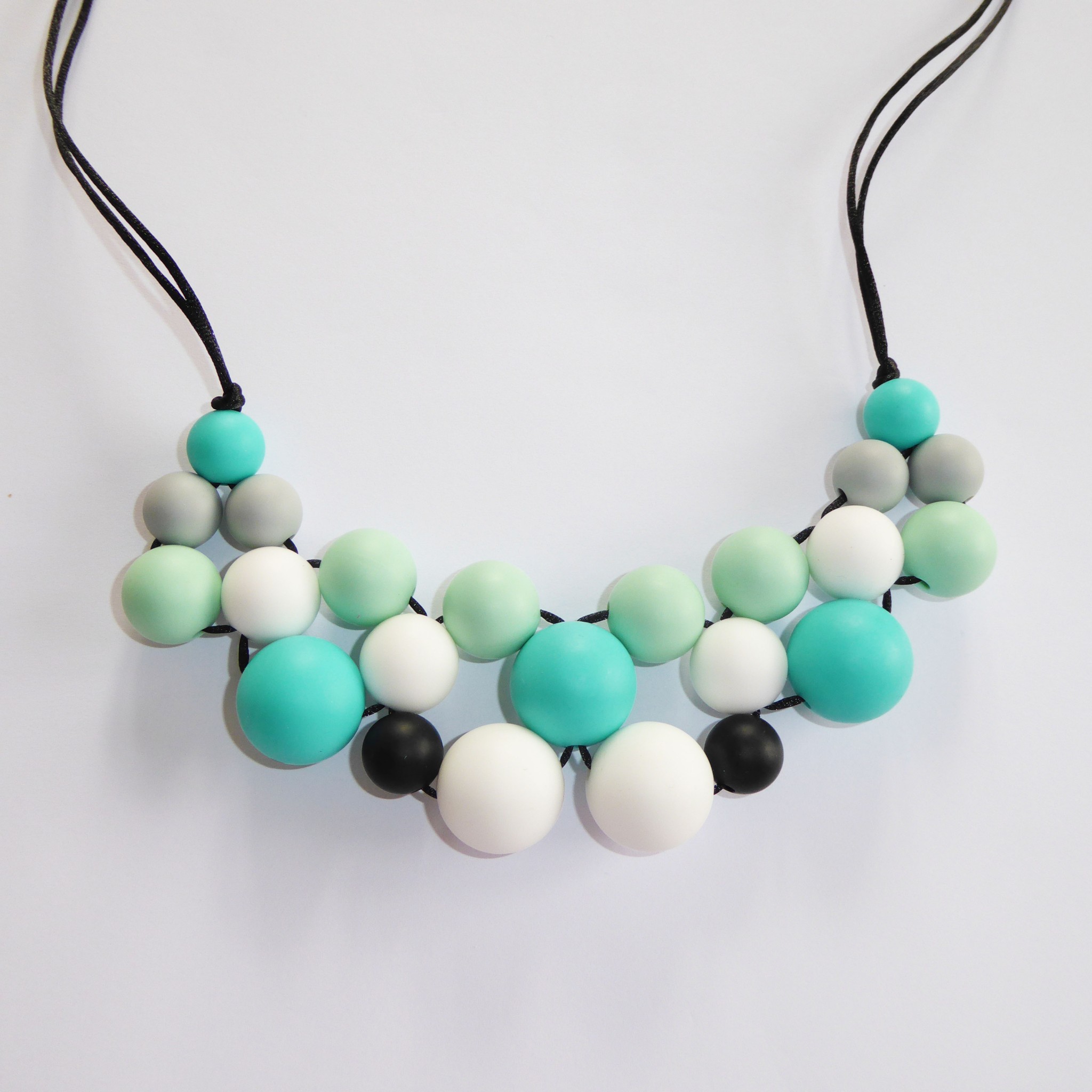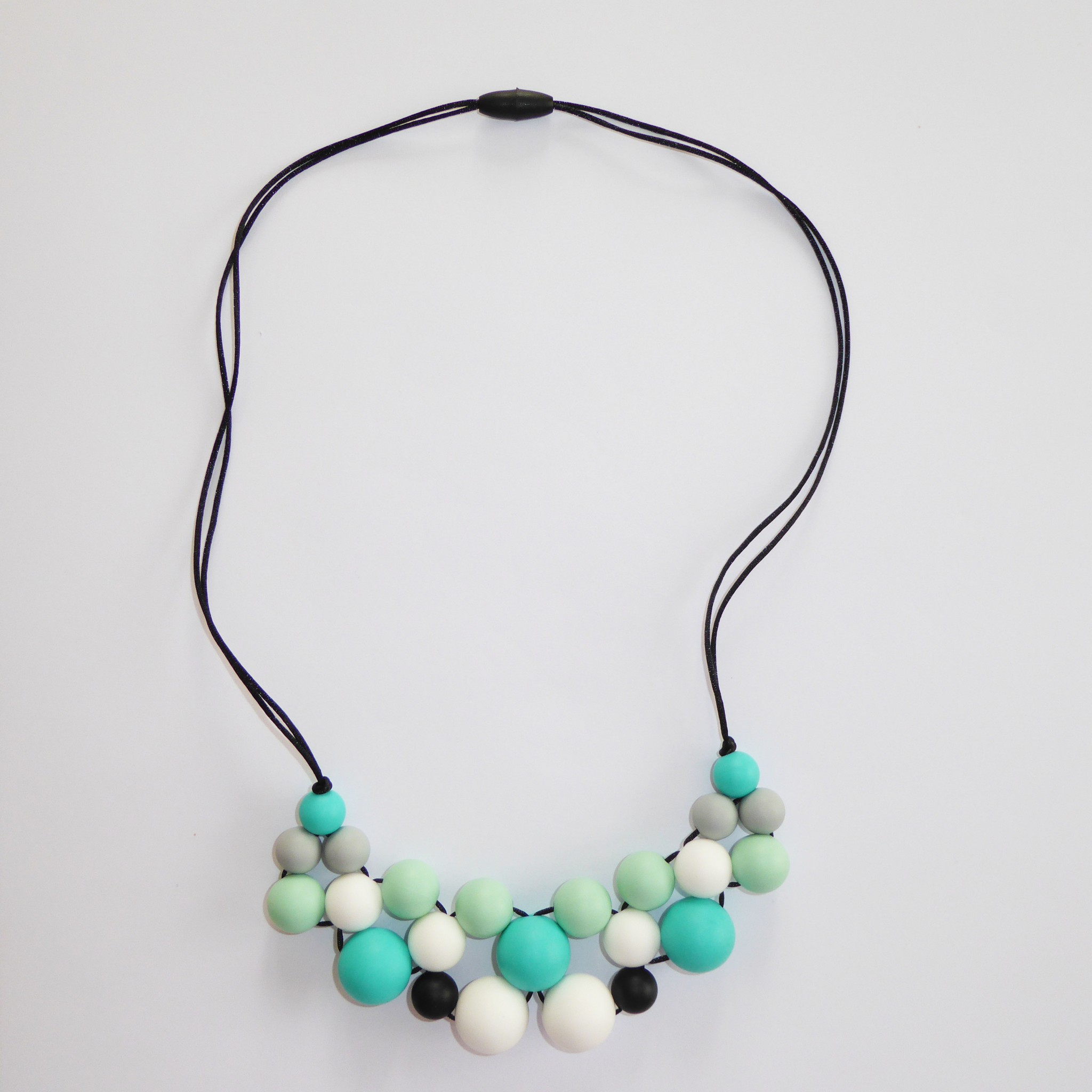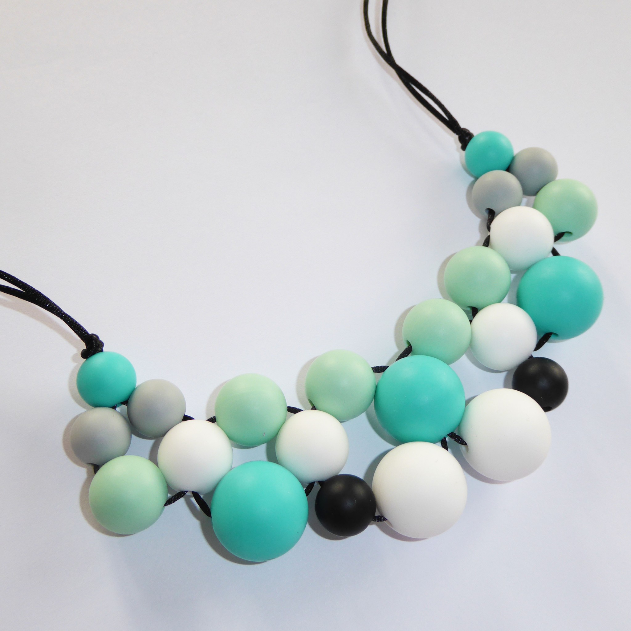 Ce collier permet des stimulations sensorielles orales, tactiles et visuelles de par ses textures, ses formes, ses couleurs.